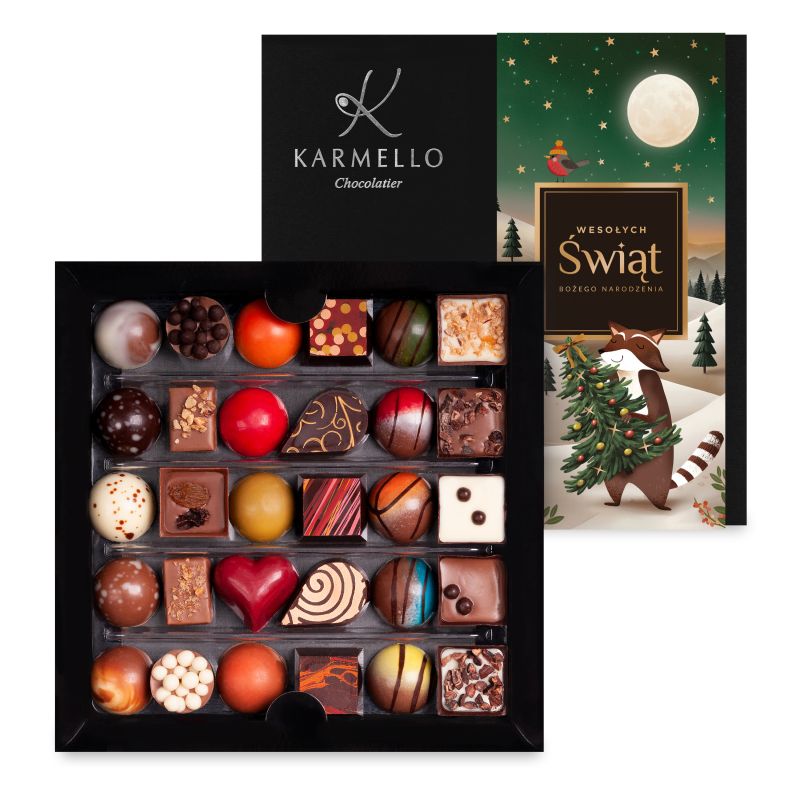 Karmello Standard to zaproszenie do magicznego świata Karmello Chocolatier. Zestaw czekoladek skomponowany w taki sposób, by móc poznać najwybitniejsze smaki naszych wyrobów, zaczynając od subtelnych, orzechowych nut, kończąc na zdecydowanych alkoholowych aromatach. Produkt atrakcyjny zarówno wizualnie, jak i smakowo.