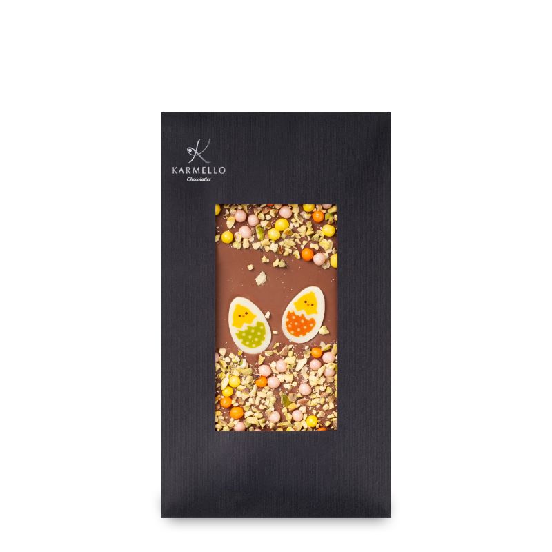 Ręcznie tworzona czekolada wielkanocna z aksamitnej czekolady mlecznej, ozdobiona wielkanocnymi pisankami, chrupiącymi pistacjami i kolorowymi kuleczkami, przyciąga wzrok i kusi od pierwszego spojrzenia. Zdobienia podkreślają jej świąteczny charakter, a dopracowana forma sprawia, że zachwyca zarówno wyglądem, jak i smakiem.