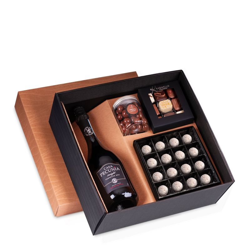 Gigant Szampański to wyrafinowany zestaw stworzony z myślą o wyjątkowych okazjach i zimowym świętowaniu. To elegancka kompozycja, która łączy głębię czekoladowych smaków z lekkością i finezją wina. Doskonały wybór na prezent, który podkreśli magię świąt i doda blasku każdej chwili.