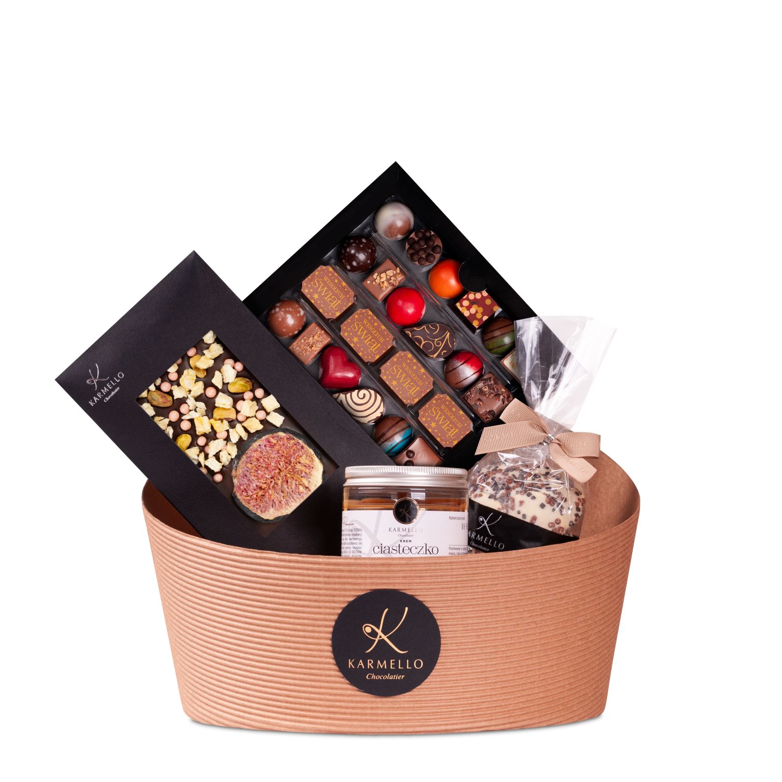 Eleganckie opakowanie po brzegi wypełnione najdoskonalszymi słodkościami od Karmello idealnie sprawdzi się jako podarunek świąteczny dla pracowników lub partnerów biznesowych. Całość zapakowana tak aby cieszyć wzrok doskonałą kompozycją.