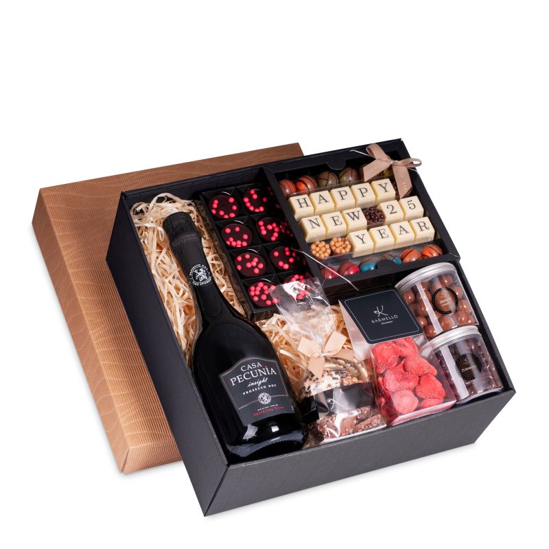 Opakowanie od Karmello wypełnione po brzegi słodkościami idealnie sprawdzi się jako Noworoczny prezent dla partnerów biznesowych lub współpracowników. Każda obdarowana osoba znajdzie coś dla siebie.