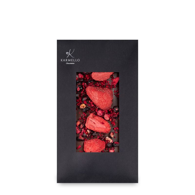 Tafla mlecznej, belgijskiej czekolady udekorowana liofilizowanymi truskawkami, porzeczkami i wiśniami. Całość zapakowana w elegancką kopertę z okienkiem.