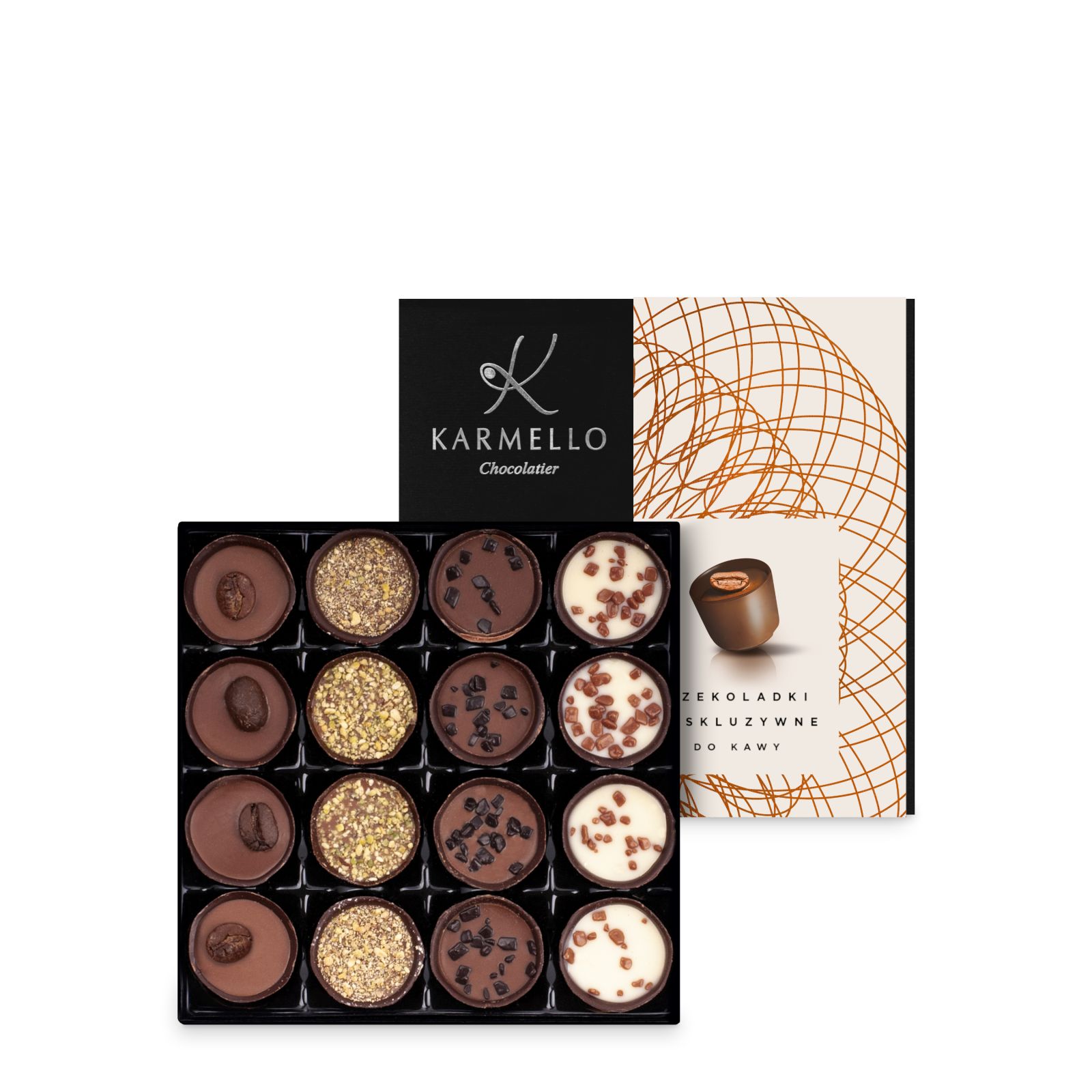 Pobudzające aromaty arabiki i robusty zamknięte w czekoladowych kubeczkach od Karmello, to nasza wariacja na temat kawy w czterech smakowych propozycjach. Kompozycja doskonała jako dodatek do upominku dla współpracowników lub klientów biznesowych.