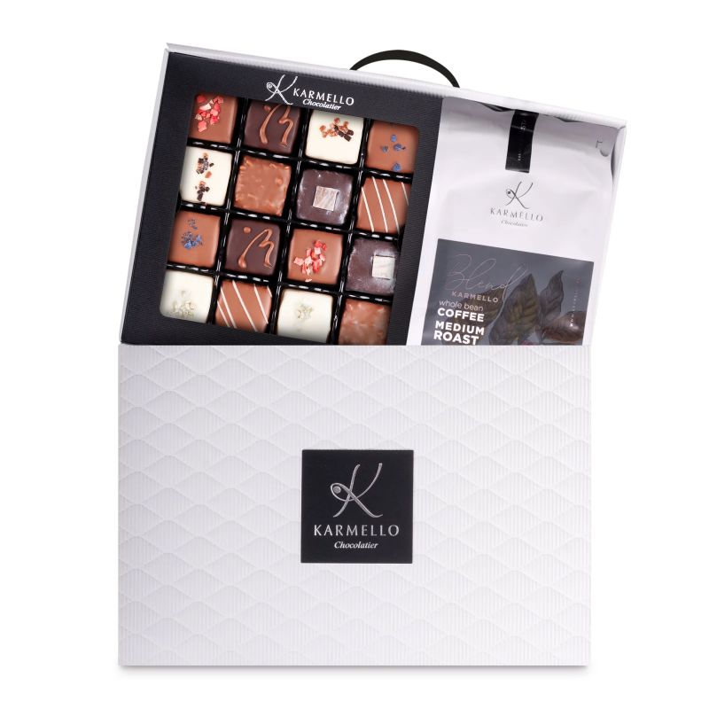 Połączenie zestawu pralin w świątecznym wydaniu oraz świeżo palonej, ziarnistej kawy Karmello zamknięte w praktycznym i eleganckim opakowaniu Neseser. Idealna propozycja na Bożonarodzeniowy podarunek.