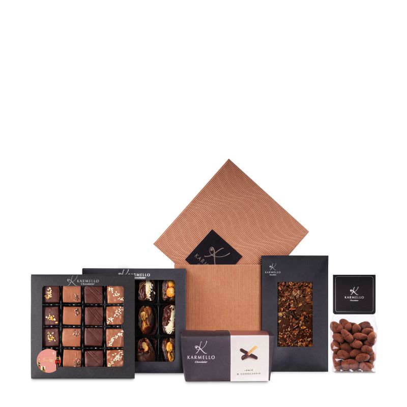 Eleganckie brązowe opakowanie zawiera produkty, które przypadną do gustu każdemu pracownikowi czy partnerowi biznesowemu. Każdy znajdzie coś dla siebie od czekoladek z nadzieniem po wykwintne daktyle. Idealna propozycja na Bożonarodzeniowy podarunek.