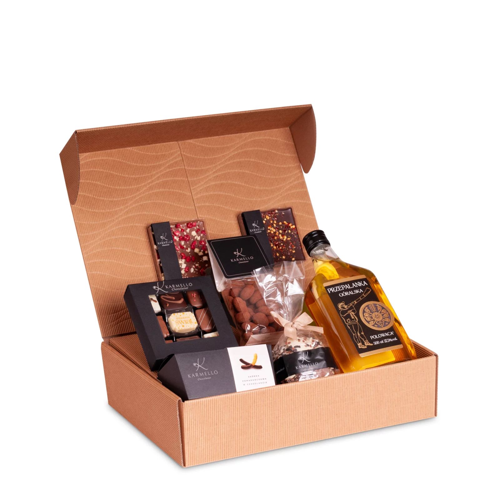 Szkatuła Góralska to propozycja dla fanów mocnych smaków. Zestaw sprawdzi się jako upominek dla kontrahentów i partnerów biznesowych. Zawiera mały przekrój znakomitości od Karmello z dodatkiem prawdziwej Góralskiej Przepalanki.