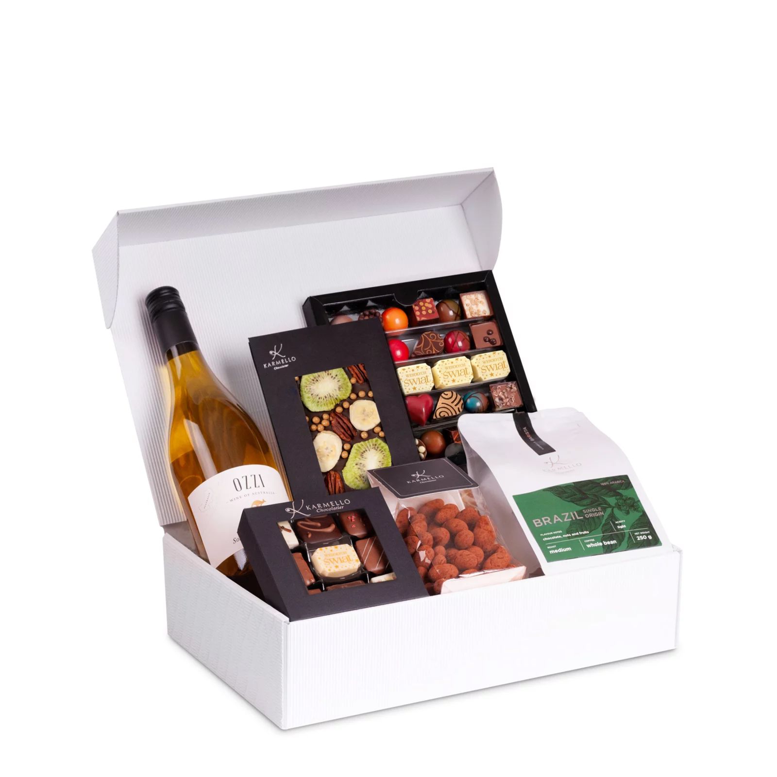 Opakowanie szkatuła po brzegi wypełnione słodkościami od Karmello to idealny pomysł na prezent dla współpracowników lub partnerów biznesowych. Każdy znajdzie w nim coś dla siebie od czekoladek z nadzieniem po kawę czy wino.