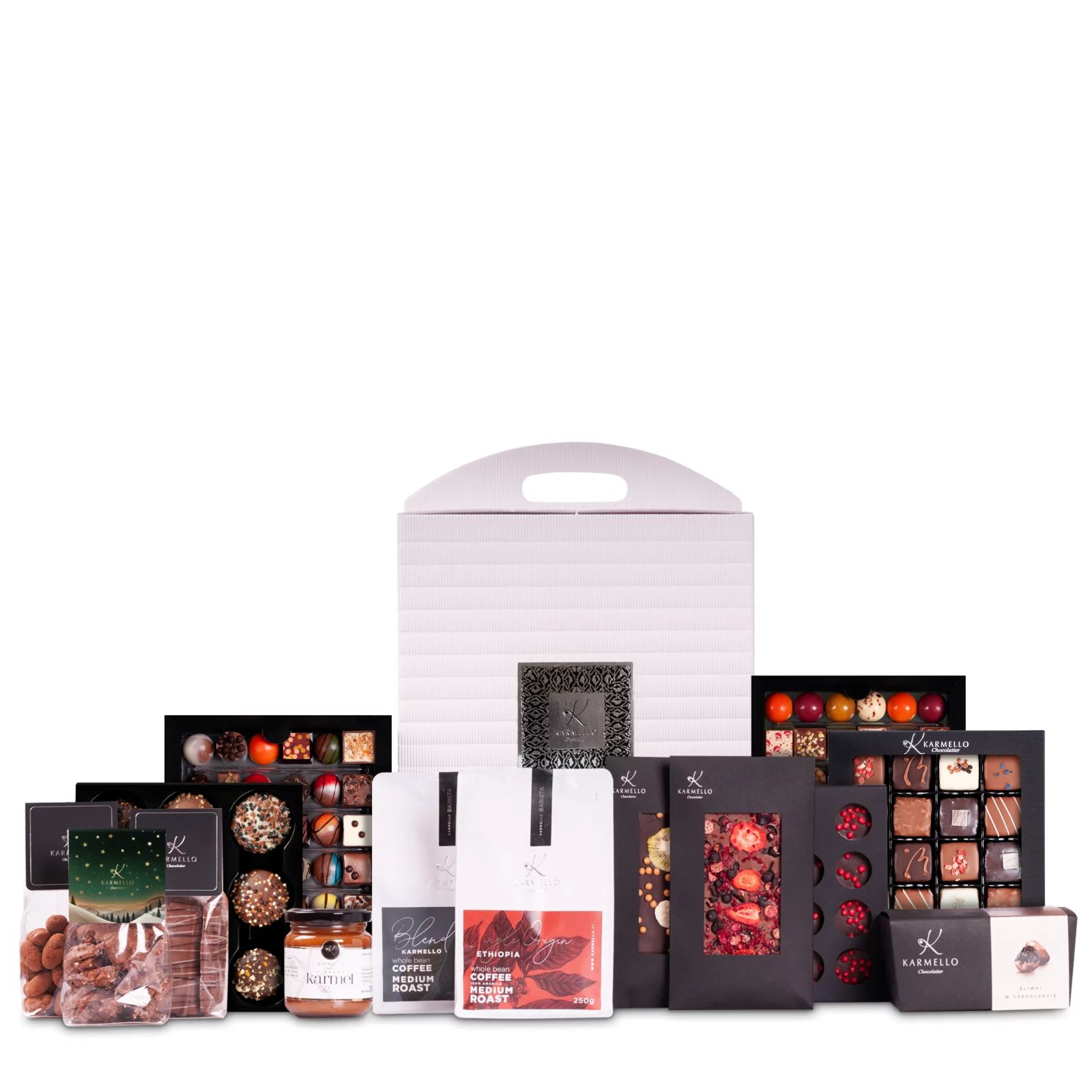 Walizka od Karmello to zestaw z całym przekrojem tego co od Karmello najlepsze. Wyśmienite czekoladki, aromatyczna kawa czy krem karmelowy to wszystko idealnie zapakowane znakomicie pasuje na prezent dla współpracowników lub partnerów biznesowych.