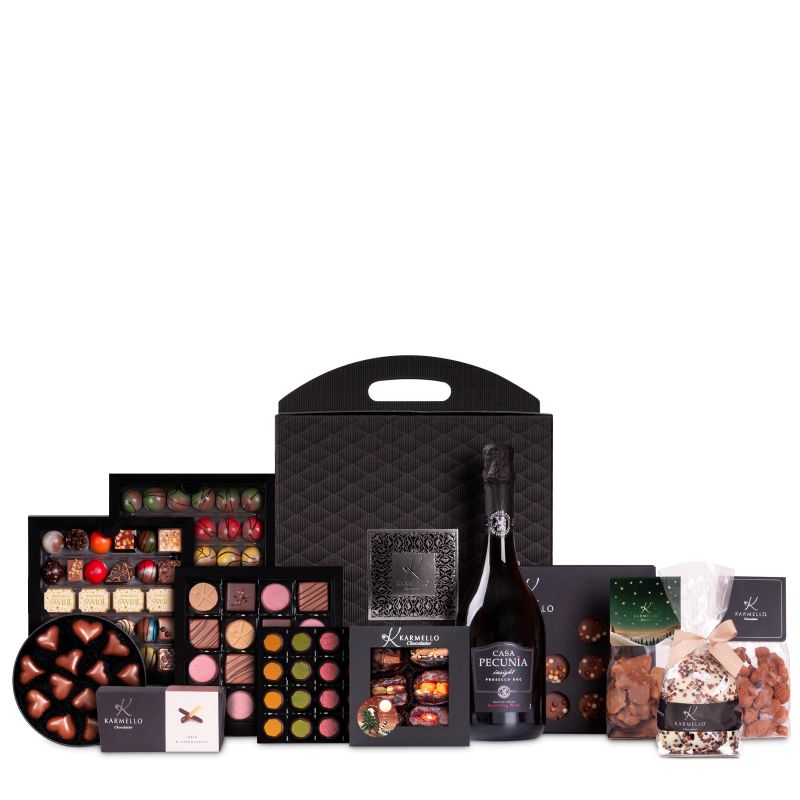 Walizka od Karmello to zestaw z całym przekrojem tego co od Karmello najlepsze. Wyśmienite czekoladki, wykwintne daktyle oraz doskonałe wino, to wszystko idealnie zapakowane znakomicie pasuje na prezent dla współpracowników lub partnerów biznesowych.