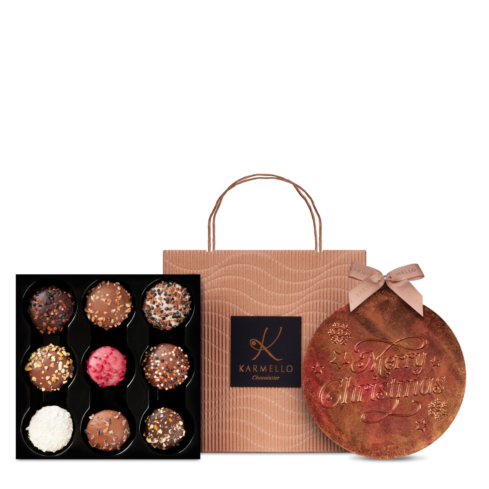 Nowa kolekcja pralin w wyjątkowych smakach w zestawie z delikatną czekoladą w kształcie bombki to duet doskonały na prezent dla współpracowników lub klientów biznesowych. Całość zapakowana w elegancką beżową torebkę.