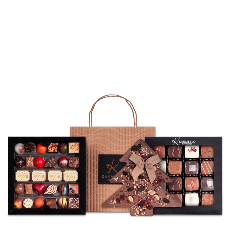 Tafla belgijskiej czekolady w kształcie choinki, kolekcja 16 pralin w świątecznym wydaniu oraz świąteczny zestaw czekoladek – połączenie, które zachwyci każdego. Produkty zapakowana w elegancką, beżową torebkę. Całość stanowi idealny świąteczny podarunek który sprawdzi się idealnie dla współpracowników czy partnerów biznesowych.
