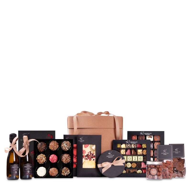 Kapelusznik Noworoczny to zestaw stworzony na pełne blasku powitanie 2026 roku. W środku czeka bogata kompozycja słodkości — od pralin i ciasteczek po czekolady i chrupiące dodatki — wszystko, co pozwala celebrować pierwsze chwile nowego roku z odrobiną czekoladowej magii. Musujące prosecco dopełnia całość, tworząc duet, który zachwyca smakiem i elegancją.