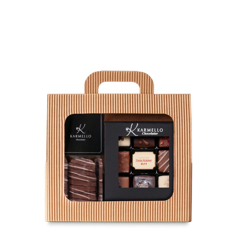 Nowe opakowanie od Karmello! Elegancka obudowa z uchwytem, aby ułatwić wręczanie podarunku oraz podglądowe okienko przez które widać całą gamę czekoladowych pyszności. Prezent idealny na Dzień Kobiet.