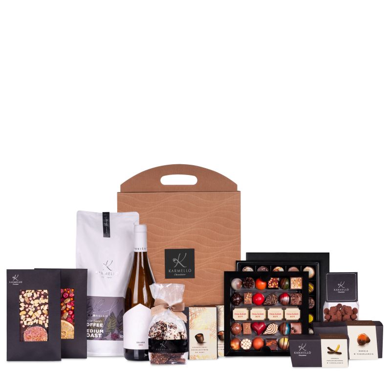 Nowy kształt eleganckiego opakowania zawiera różnorodne produkty Karmello. Zestawy czekoladek wykonane na bazie belgijskiej czekolady, owoce oblane czekoladą oraz czekolady z różnorodnymi dodatkami zachwycą wzrok i podniebienie każdego smakosza czekolady. Oprócz wyśmienitych czekoladek wykonanych na bazie belgijskiej czekolady znajdziesz również wytrawne Wino Seyval. Zestaw idealny jako upominek z okazji Dnia Kobiet.