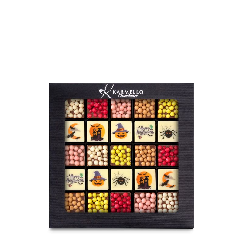 Przygotuj się na Halloween z naszym wyjątkowym zestawem czekoladek Karmello Chocolatier. W środku czekają czekoladki o smakach: orzeszek, malinka, truskaweczka, wanilka i fistaszek mleczuś – połączenie, które zachwyci każdego łasucha. Ręcznie tworzone z belgijskiej czekolady, stanowią słodki upominek pełen jesiennej magii.