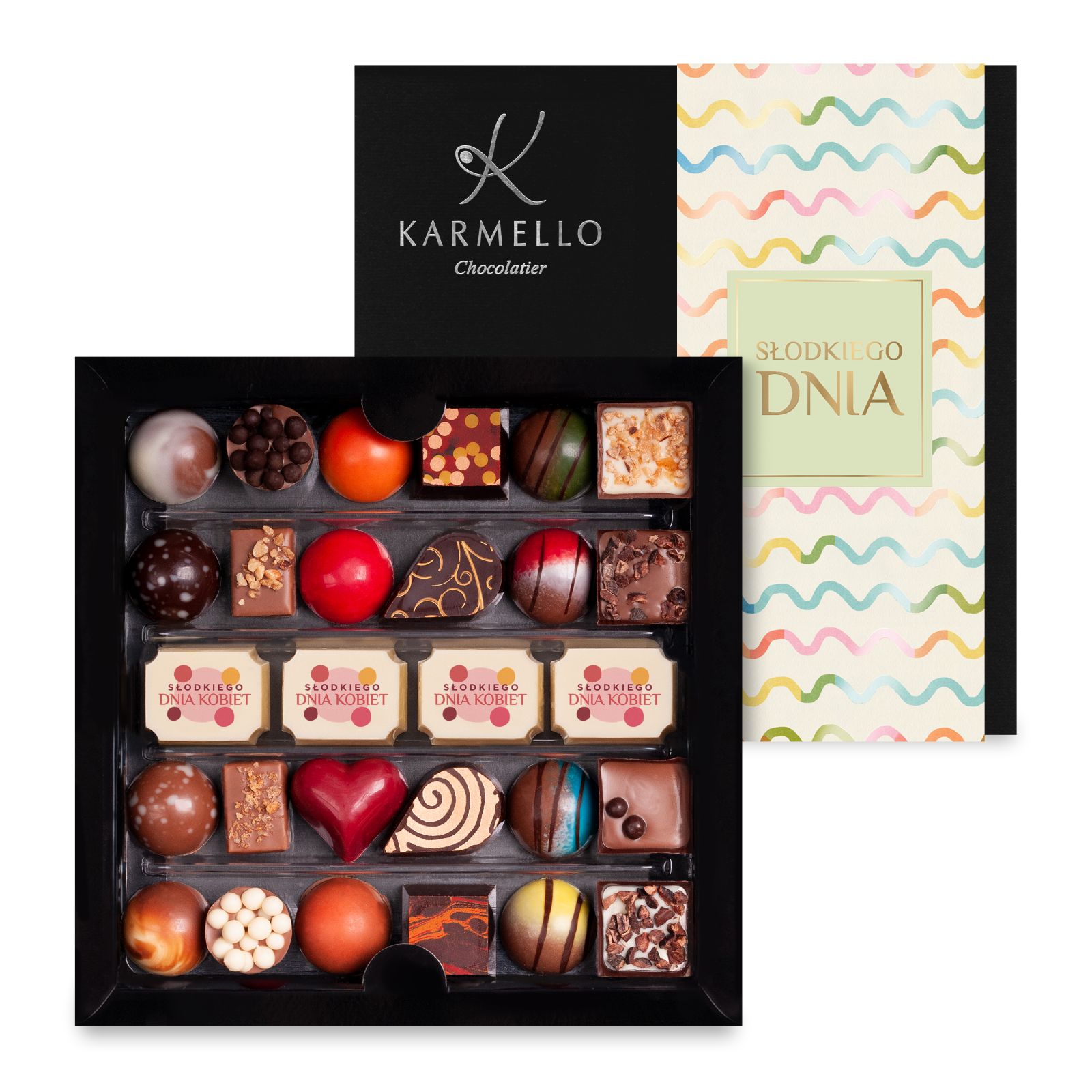 Zanurz się w słodkim świecie z naszą wyjątkową Kolekcją Karmello Standard, stworzoną z myślą o Dniu Kobiet! Oferujemy niepowtarzalne smaki i wyjątkowe opakowania, które sprawią, że ten dzień będzie jeszcze bardziej magiczny i pełen słodkich doznań. Zestaw dodatkowo zawiera czekoladki z okazjonalnym nadrukiem oraz opaskę z napisem „Słoskiego Dnia”.