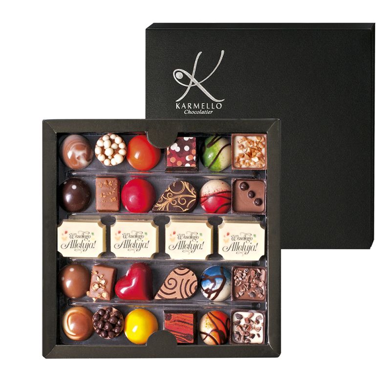 karmello standard to zaproszenie do magicznego świata karmello chocolatier. zestaw czekoladek skomponowany w taki sposób, by móc poznać najwybitniejsze smaki naszych wyrobów, zaczynając od subtelnych, orzechowych nut, kończąc na zdecydowanych alkoholowych aromatach. zestaw zawiera czekoladki z okolicznościowym nadrukiem.