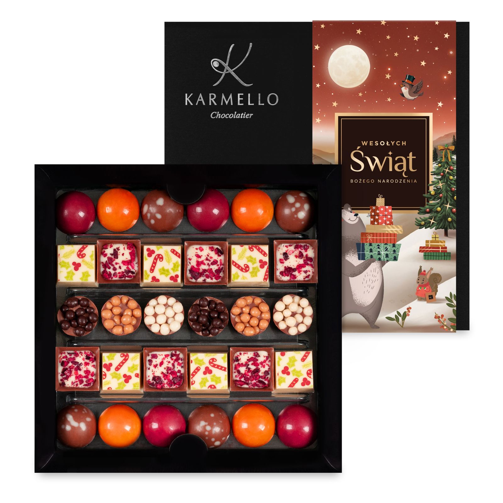 Reniferowa Kolekcja to świąteczny zestaw czekoladek mieszanych, wzbogacony uroczą, świąteczną opaską. W środku znajdują się czekoladki o różnorodnych nadzieniach – owocowych, orzechowych i kremowych – które łączą delikatność czekolady z intensywnymi smakami. To idealny, nastrojowy upominek, który dodaje słodkiej magii każdemu zimowemu dniu.