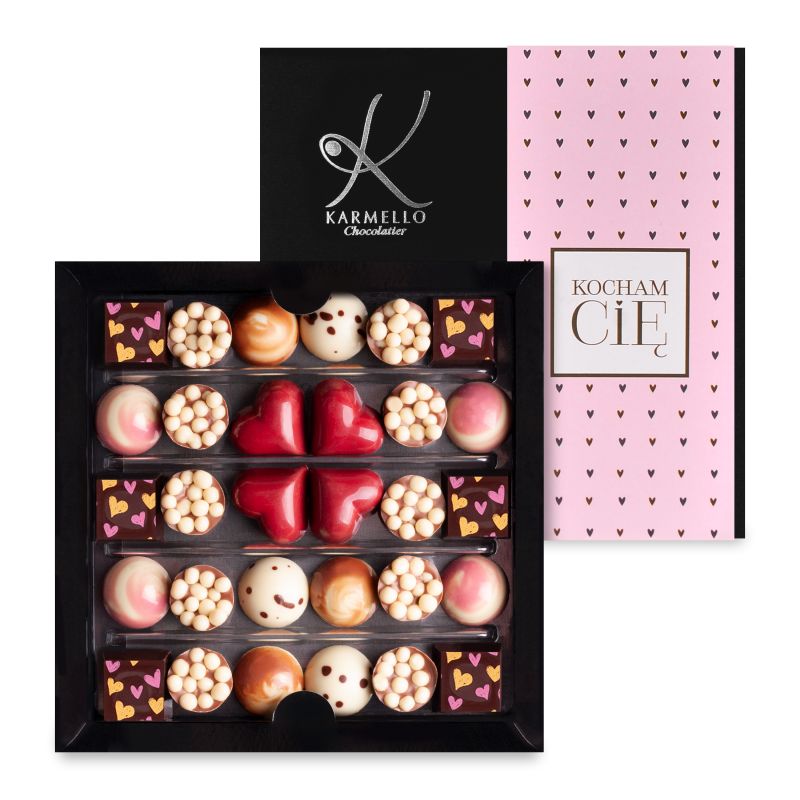 kompozycja czekoladek skomponowana tak aby zachwycić każdą obdarowaną kobietę. zestaw dodatkowo zawiera czekoladki w kształcie maleńkich czerwonych serduszek oraz udekorowany jest opaską z napisem "kocham cię".