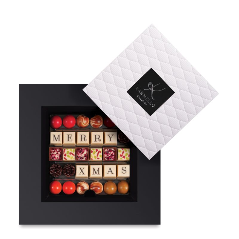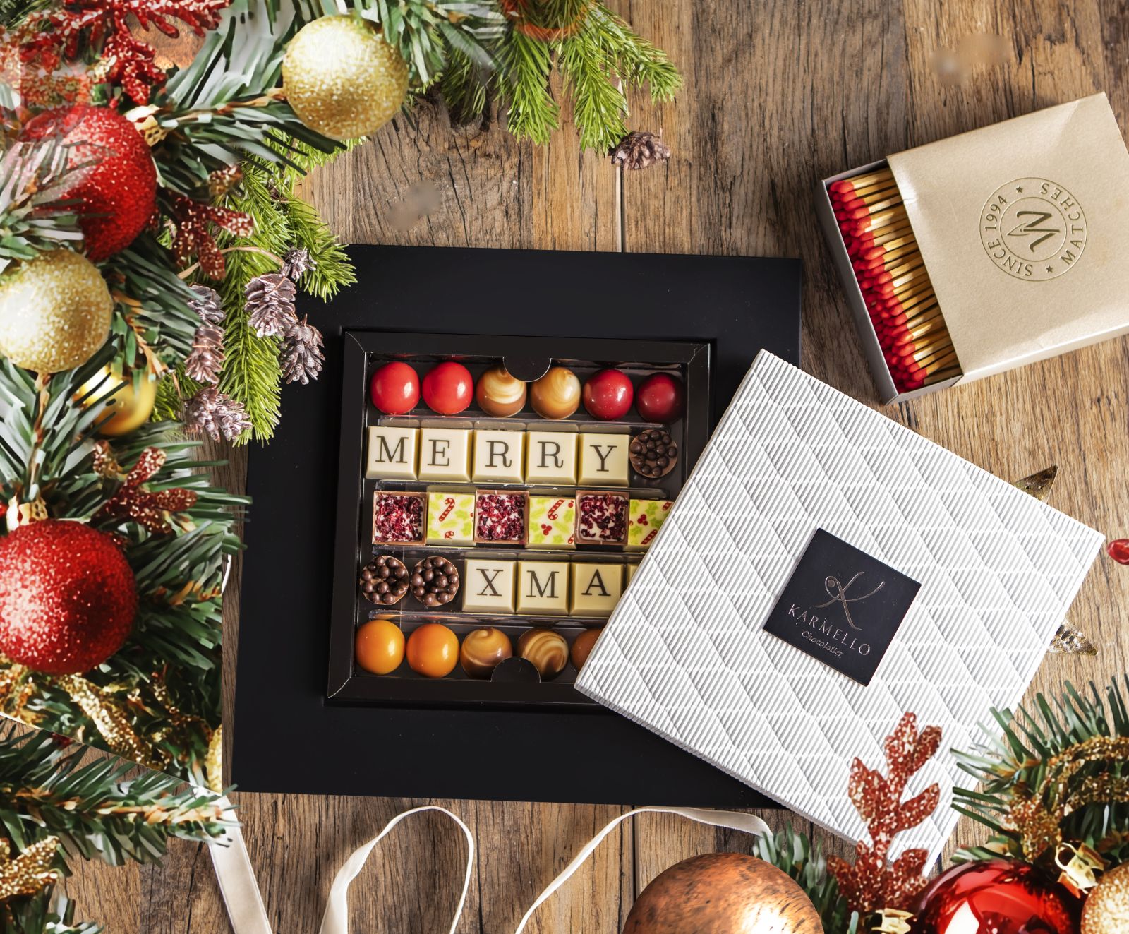 Słodka wiadomość w wyjątkowej formie – ręcznie wykonane czekoladki układają się w napis „Merry Xmas”, tworząc niepowtarzalny zestaw o świątecznym charakterze. Każda czekoladka zachwyca smakiem, aromatem i finezyjnym wykonaniem. To połączenie elegancji, radości i świątecznej magii – idealne na prezent, który wywoła uśmiech i doda blasku każdemu spotkaniu.