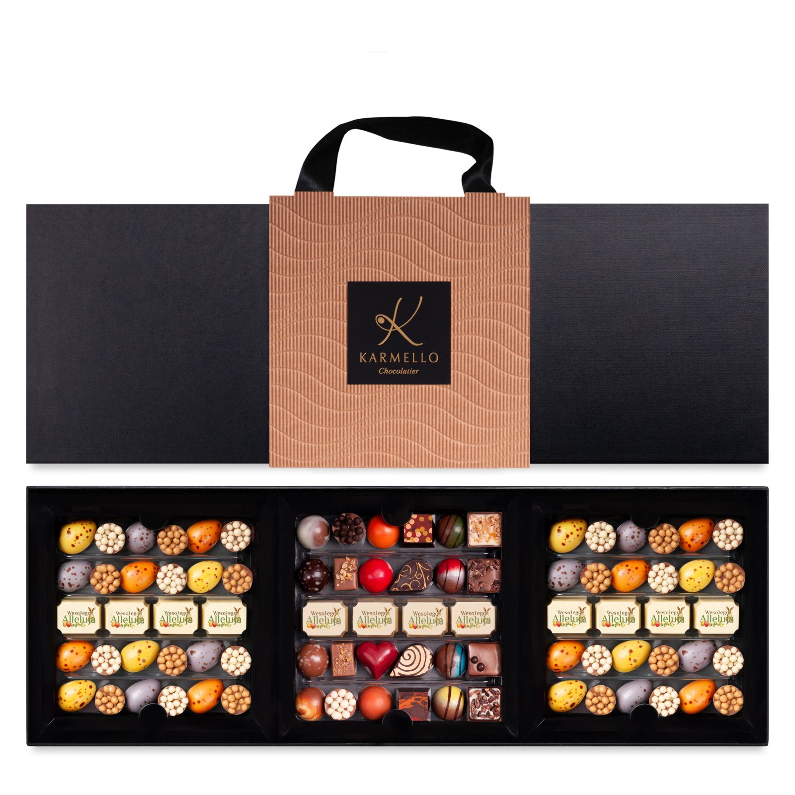 Połączenie bestselerowej Kolekcji czekoladek Karmello Standard z wielkanocnymi pisankami w pięciu wyjątkowych smakach to idealna propozycja dla wszystkich miłośników słodkości, którzy pragną wzbogacić swoje święta o niezapomniane doznania smakowe. W eleganckim opakowaniu znajdziemy starannie wyselekcjonowane czekoladki, które zachwycą nie tylko wyglądem, ale także bogactwem smaków. Opakowanie wzbogacone o uchwyt, który ułatwia wręczenie podarunku.