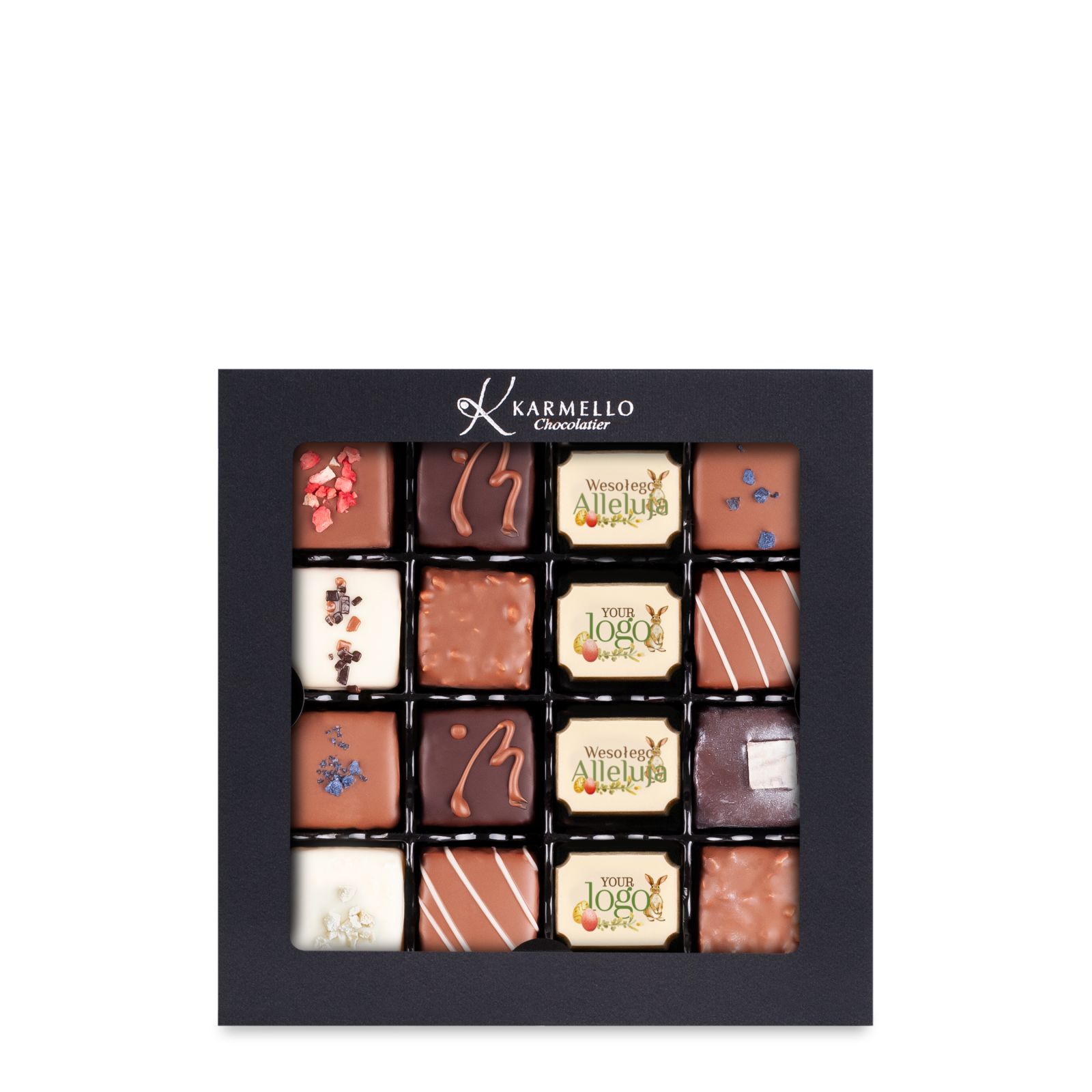 KW26/10 WIELKANOCNA KOLEKCJA 16 PRALIN Z LOGO I WESOŁEGO ALLELUJA
