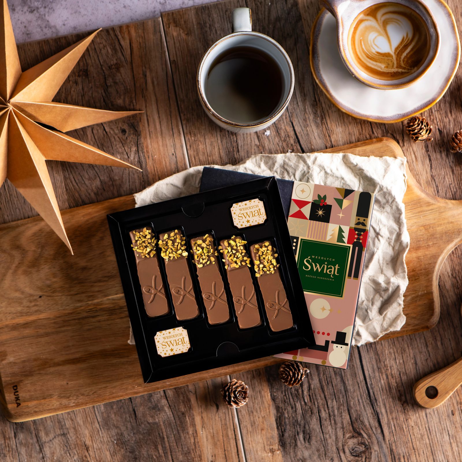 Opakowanie z okienkiem, wypełniona eleganckimi czekoladowymi sztabkami, zachwyca wyglądem i subtelnym, świątecznym charakterem. To połączenie elegancji i świątecznej radości – idealny upominek dla tych, którzy cenią sobie piękno w prostocie i wykwintny smak w każdym detalu.