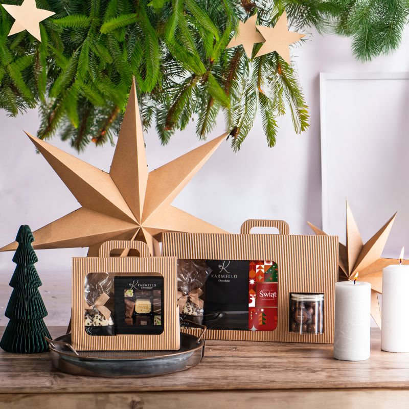 Elegancka torebka z okienkiem, wypełniona smakowitymi świątecznymi przysmakami. W środku znajduje się kolekcja czekoladek świątecznych, bakalie w czekoladzie oraz tradycyjne ciasteczka piernikowe. Piękny i słodki prezent, który wprowadzi każdego w magiczny, bożonarodzeniowy nastrój.