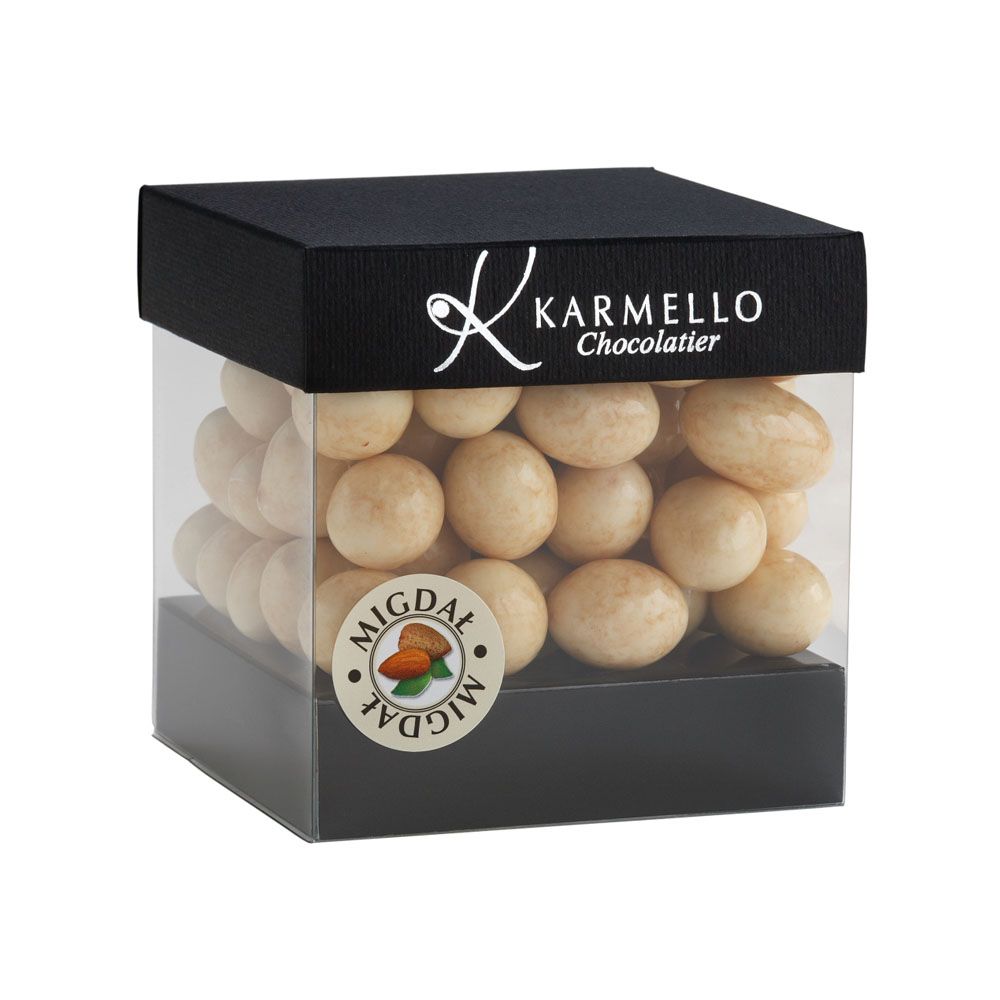 Chrupiące, prażone migdały, otoczone słodkością białej czekolady.