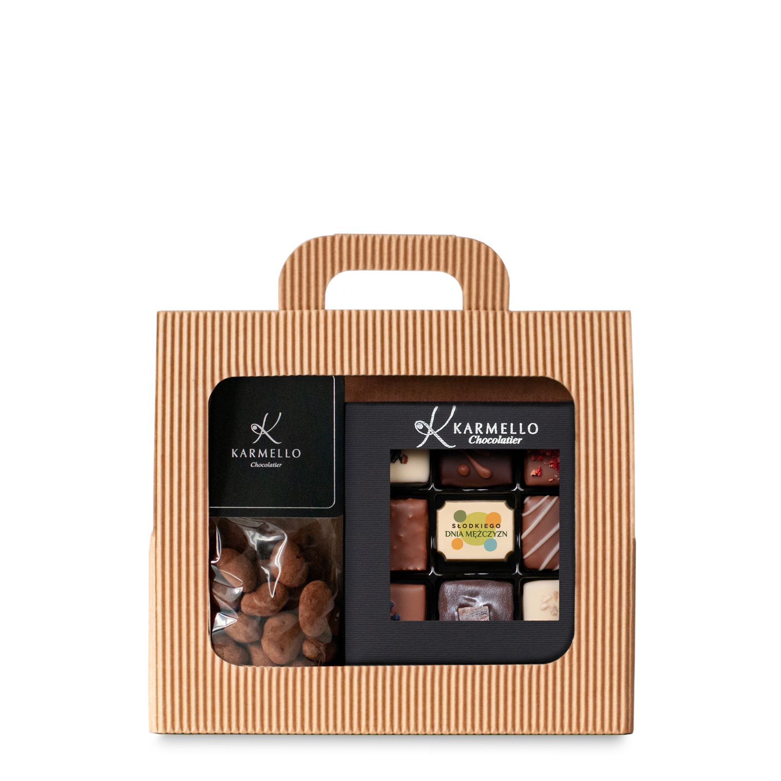 Eleganckie opakowanie z uchwytem, aby ułatwić wręczanie podarunku oraz podglądowe okienko przez które widać całą gamę czekoladowych pyszności. Prezent idealny na Dzień Mężczyzny.