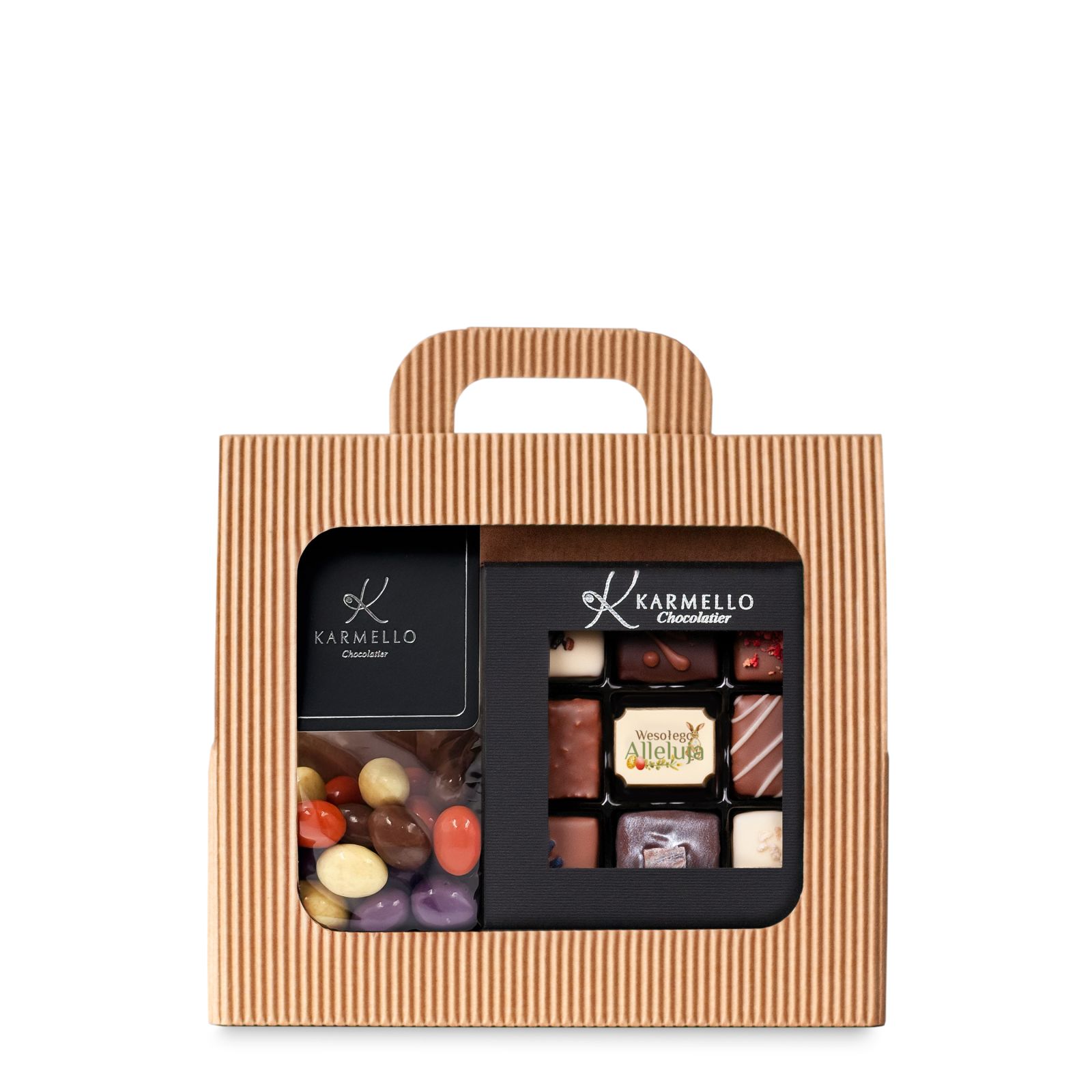 Zestaw Karmello to połączenie dwóch słodkich przyjemności: kolorowych migdałów w czekoladzie oraz Wielkanocnej Kolekcji 9 pralin. To kompozycja, w której aksamitna czekolada spotyka się z chrupiącym wnętrzem migdałów i bogactwem pralinkowych smaków. Całość zamknięta jest w efektownym opakowaniu w formie mini torebki.