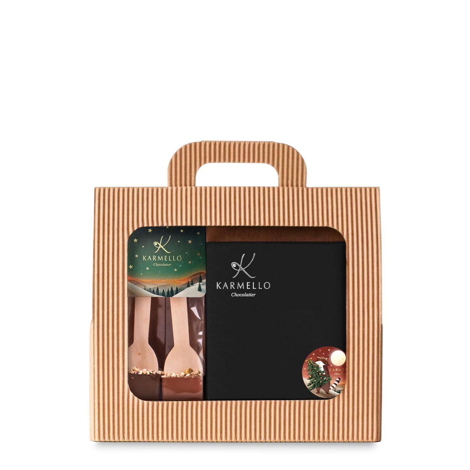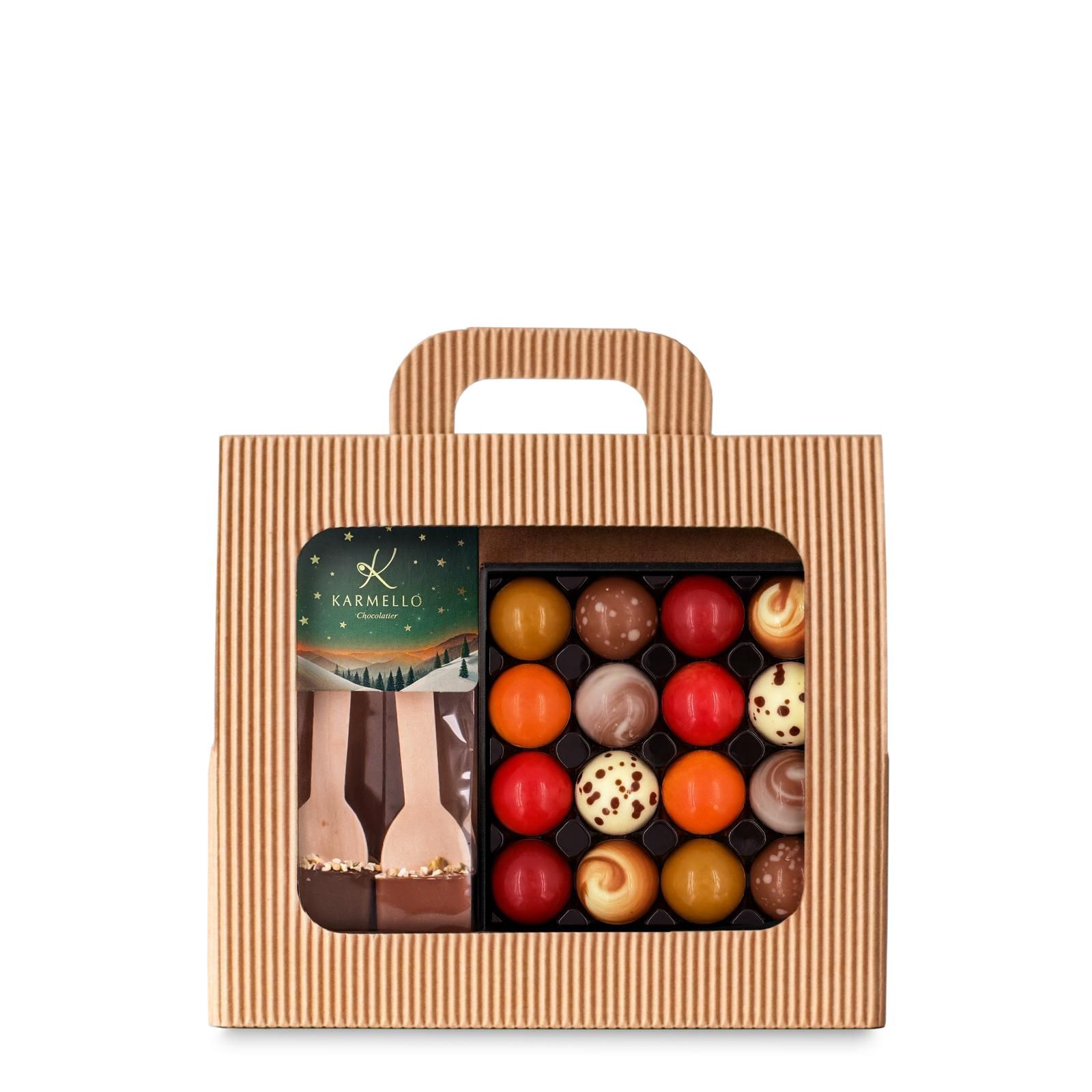 Uroczy, świąteczny upominek w eleganckiej torebce z okienkiem. W środku znajdują się czekoladki o różnych smakach oraz aromatyczne sticksy. Idealny prezent dla bliskiej osoby, współpracownika lub jako słodki dodatek do świątecznego podarunku.