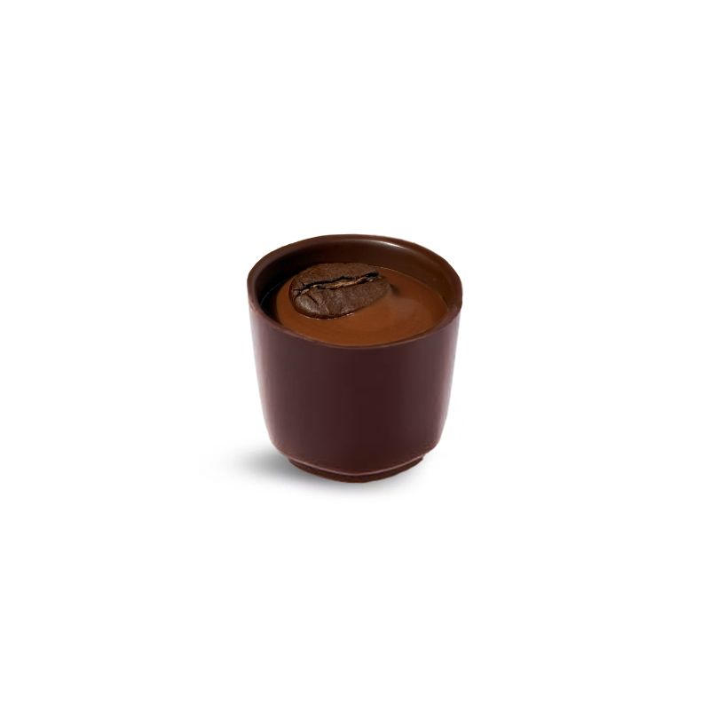 Ziarno kawy stanowi zwieńczenie czekoladki w ciemnej czekoladzie, skrywającej nadzienie na bazie mlecznej czekolady i odrobiny kawy.