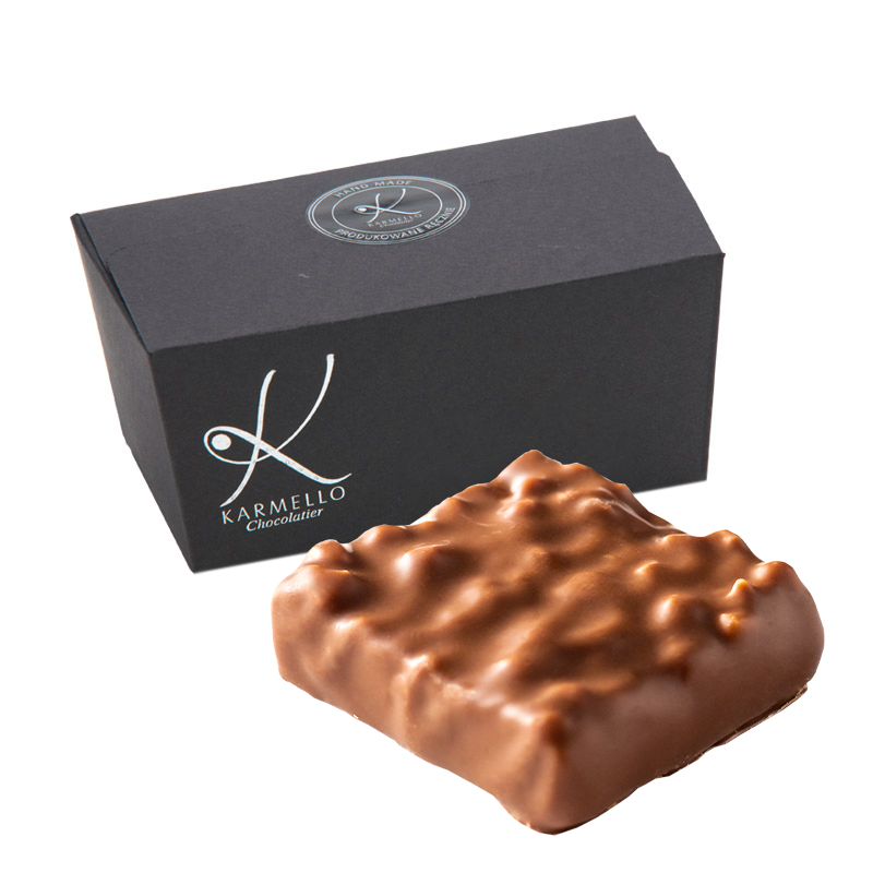Tradycyjny smak orzecha połączony z aksamitną, mleczną czekoladą, udekorowany owocem orzecha laskowego.