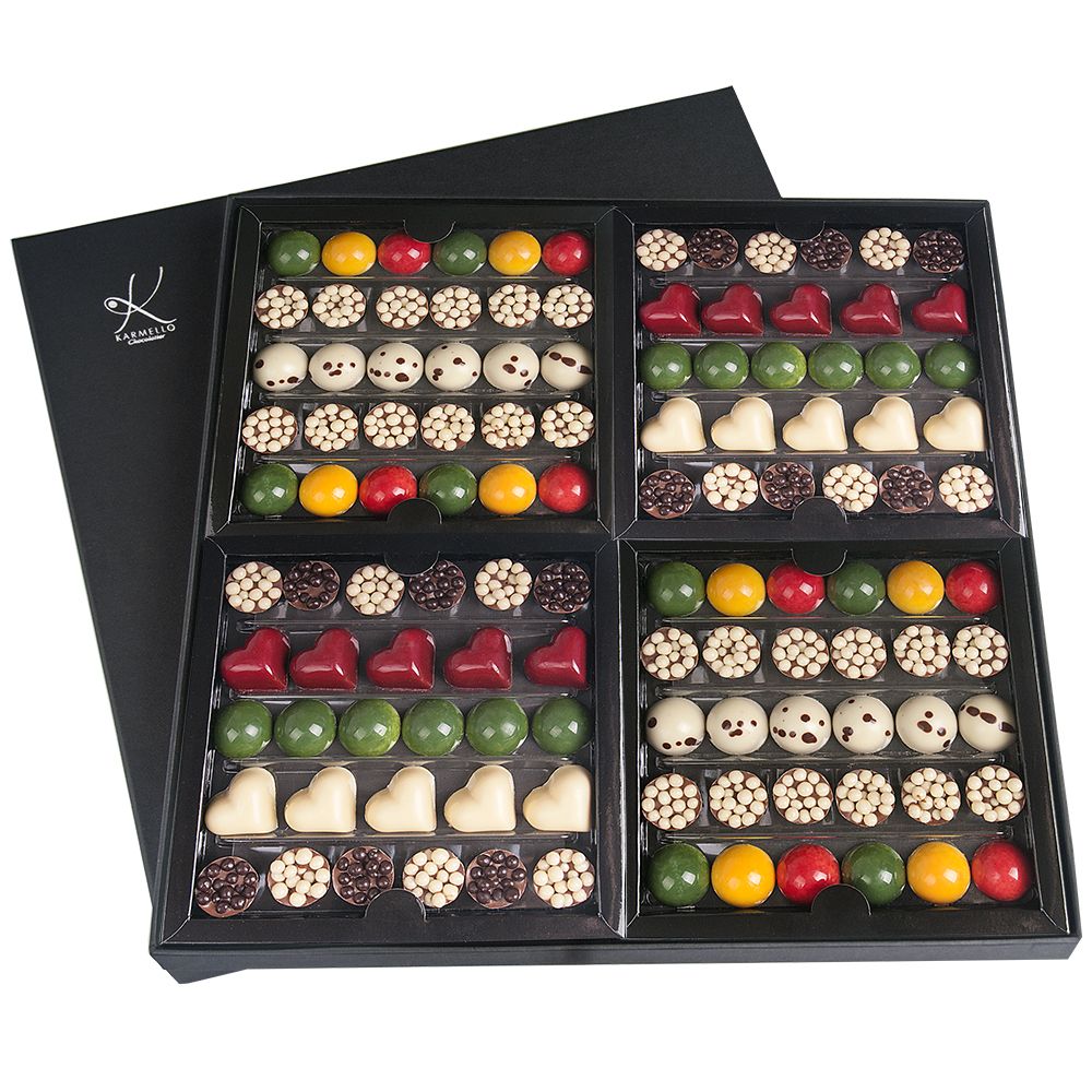 czekoladki umieszczone zostały w czterech osobnych pudełeczkach, które zebrane są w eleganckie opakowanie- tak, byś mógł cieszyć się nimi wszystkimi, lub każdym pudełeczkiem z osobna.