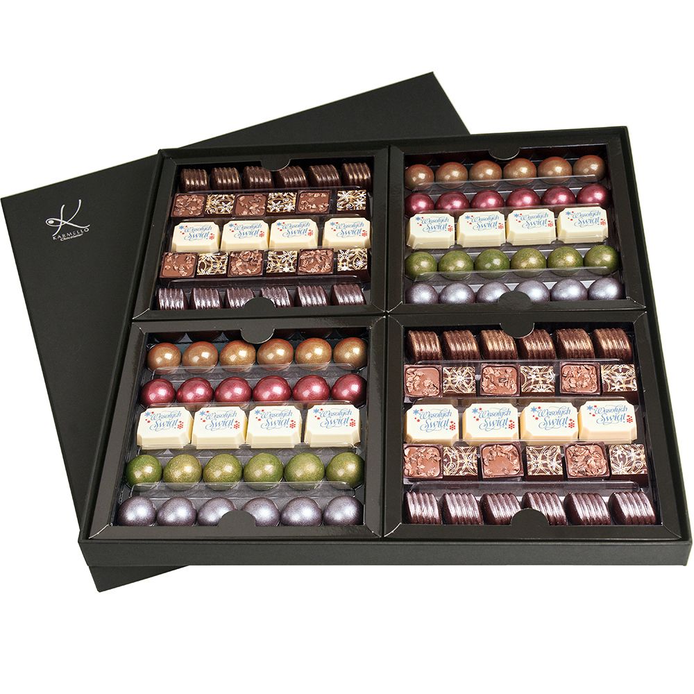 Poniższe słodkie upominki stanowią przykładową, poglądową ofertę, jaką przygotowujemy z myślą o poszczególnych świętach i wydarzeniach okolicznościowych. Za każdym razem, uzupełniamy ją o nowe i jeszcze pyszniejsze pralinki i czekoladki na święta. Zapraszamy do składania zamówień w okresie poprzedzającym konkretne święto bądź szczególną okazję. Jeśli już teraz szukają Państwo pomysłu na słodki upominek - zachęcamy do zapoznania się z czekoladowymi pomysłami na prezent, które znajdują się na stałe w naszej ofercie.
