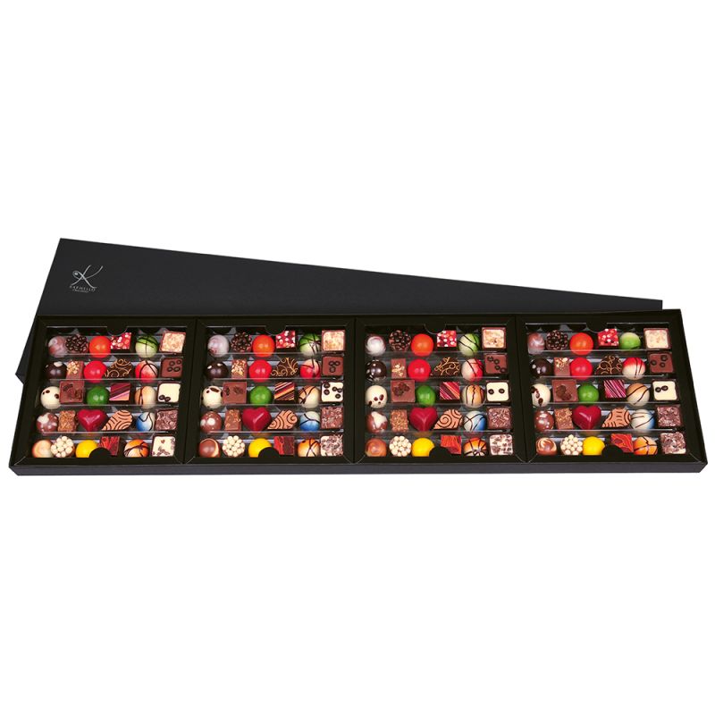podłużny zestaw świąteczny – klasyczne linie eleganckiego opakowania podkreślają walory wizualne wykonanych z najwyższą starannością czekoladek. kompozycja ta pozwoli ci zaprosić najbliższych na wyjątkową, bożonarodzeniową degustację smaków karmello chocolatier. czekoladki umieszczone zostały w czterech osobnych pudełeczkach, które zebrane są w eleganckie opakowanie- tak, byś mógł cieszyć się nimi wszystkimi, lub każdym pudełeczkiem z osobna.