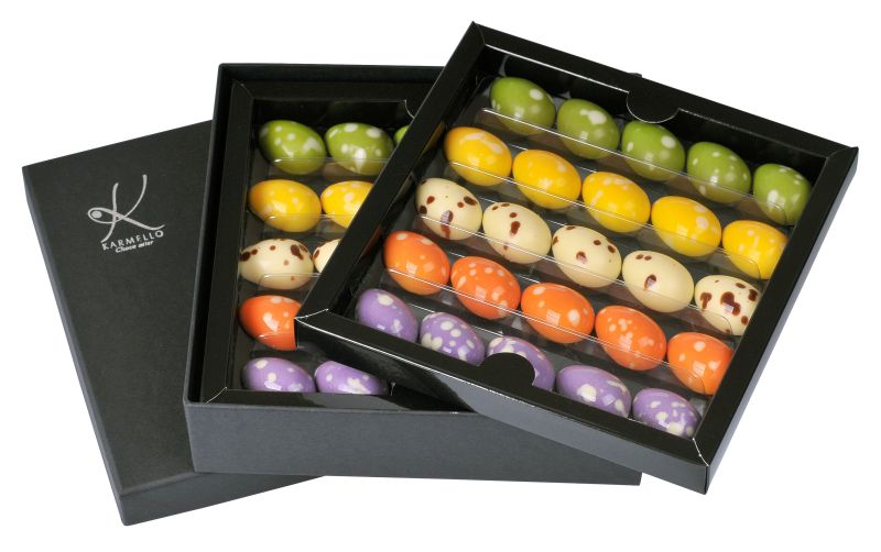 eleganckie, minimalistyczne pudełko skrywa 50 wyjątkowych w smaku i formie czekoladek. kompozycja niepowtarzalnych aromatów pozwoli tobie i twoim najbliższym odkryć nowe, nieznane dotąd płaszczyzny doznań smakowych, delektując się nimi podczas spotkań przy wielkanocnym stole.