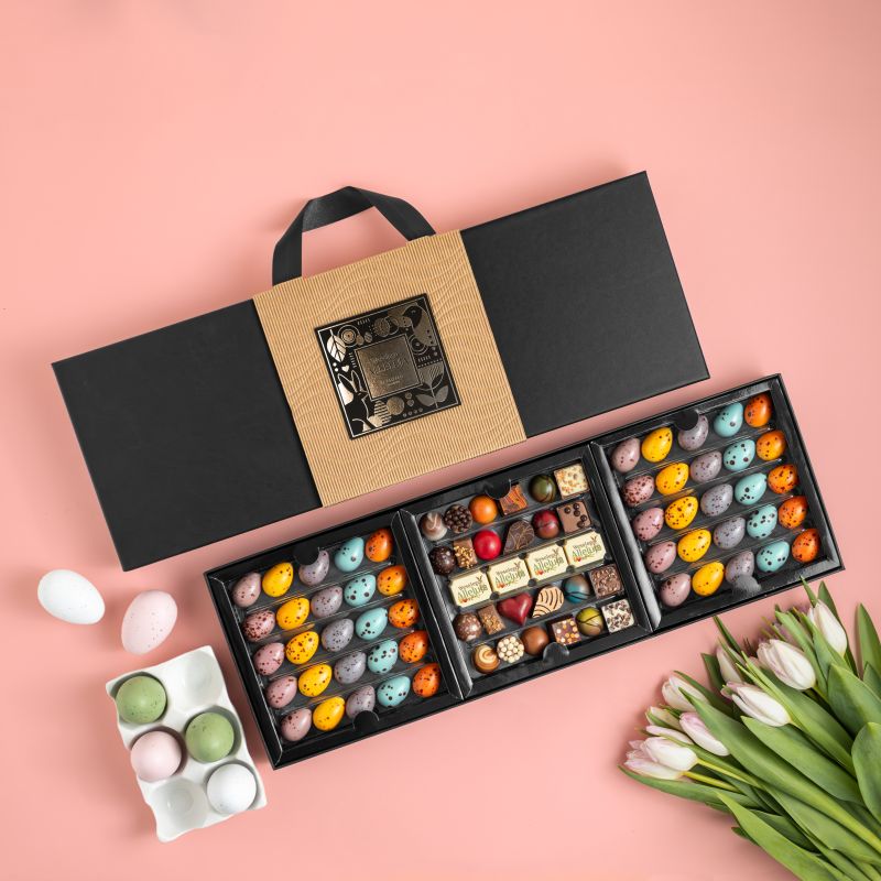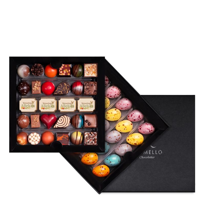 Ten zestaw łączy to, co w Karmello najbardziej lubiane: bestsellerową kolekcję Karmello Standard oraz kolorowe wielkanocne pisanki w pięciu smakach. Całość tworzy spójną i dopracowaną propozycję prezentową na okres świąteczny. Całość zachwyca różnorodnością – od klasycznych, czekoladowych nut po bardziej zaskakujące akcenty – a eleganckie opakowanie sprawia, że zestaw prezentuje się wyjątkowo estetycznie i spójnie.