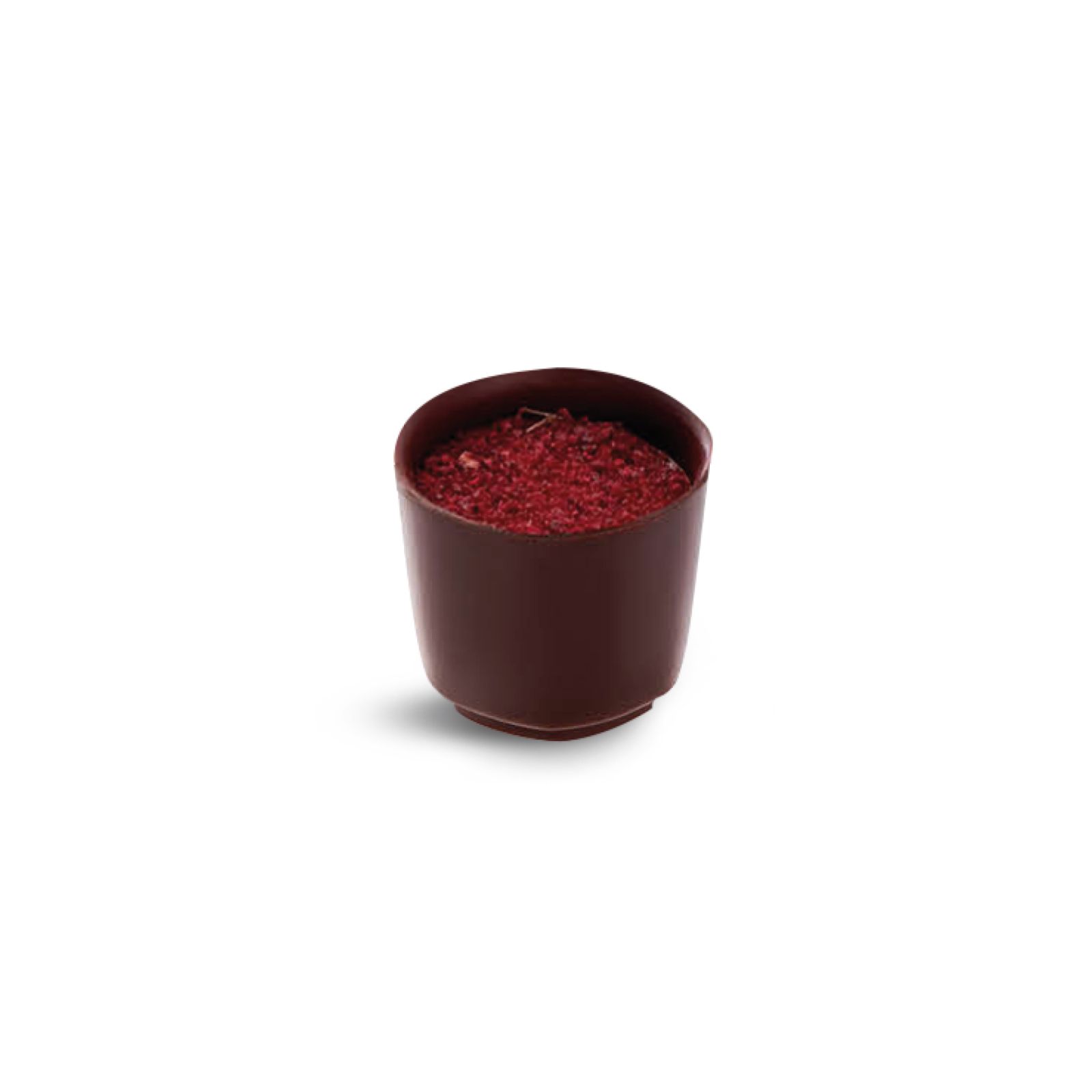 Niepowtarzalna kompozycja smaków: rozpływająca się w ustach, mleczna czekolada terra połączona z doskonałym, czerwonym winem, uzupełnione aromatycznym cynamonem i ostrością czarnego pieprzu. Smaki dodatkowo podkreśla delikatnie kwaśna, liofilizowana wiśnia, będąca jednocześnie dekoracją czekoladki.