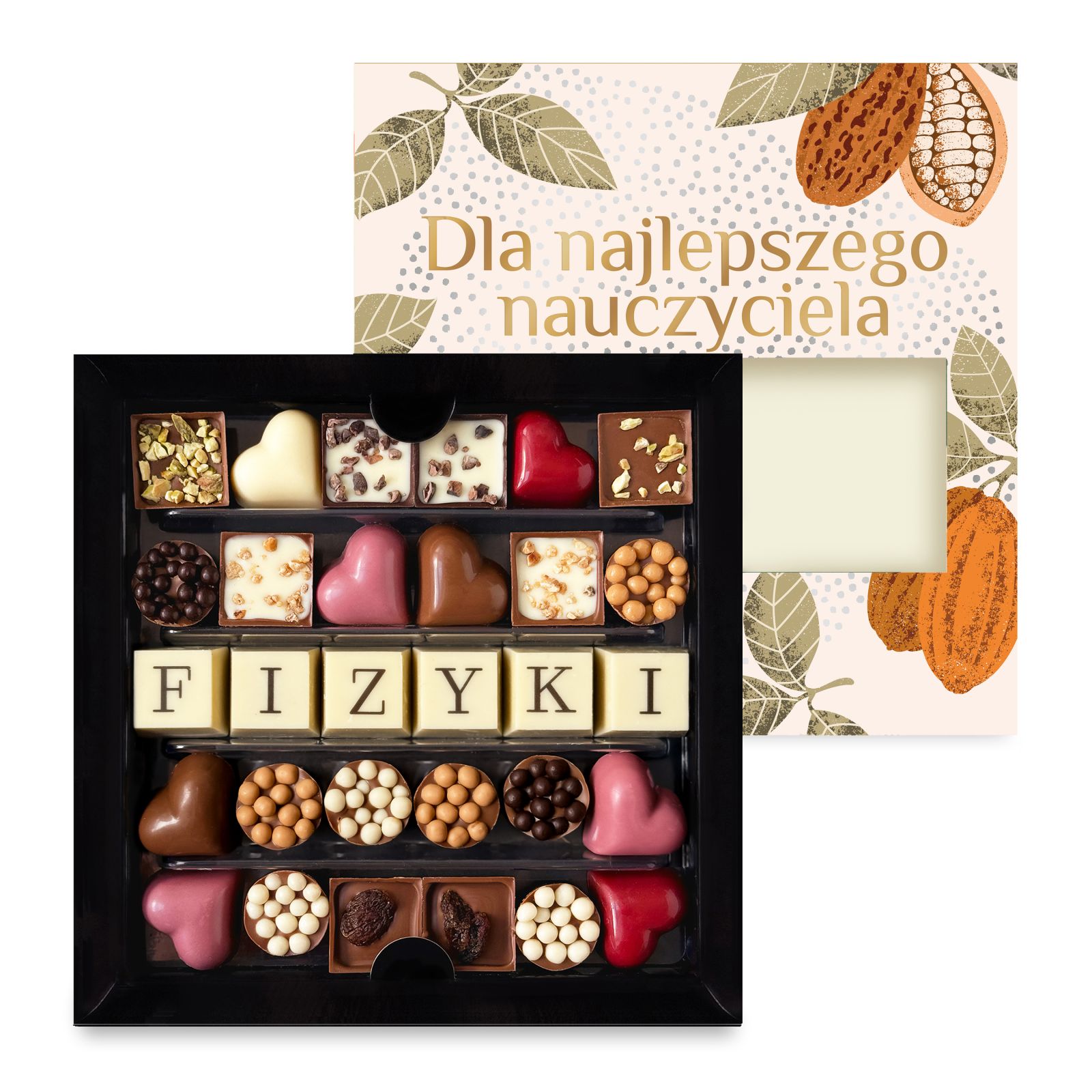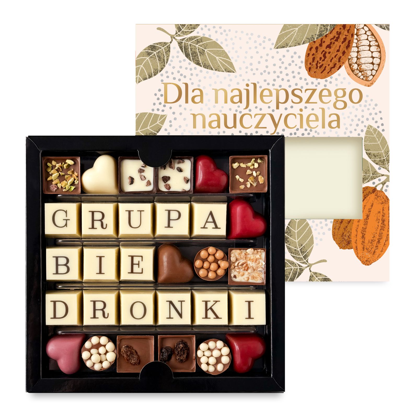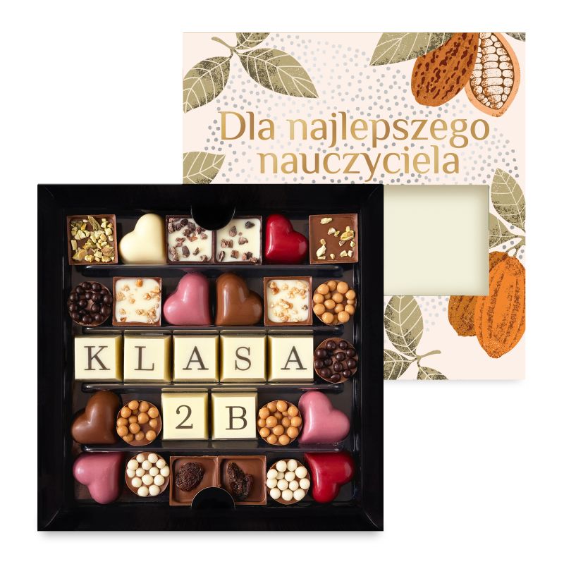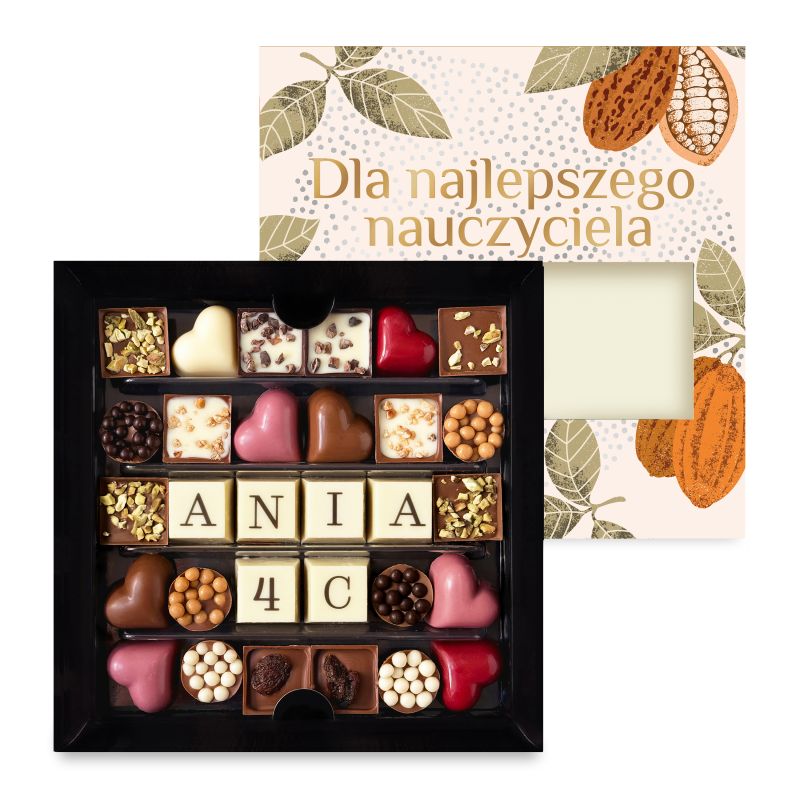 Personalizowany zestaw czekoladek na Dzień Nauczyciela – z możliwością dodania imienia, nazwy klasy lub grupy. Eleganckie pudełko z opaską „Super Nauczyciel” skrywa ręcznie tworzone czekoladki z belgijskiej czekolady – dopracowane w każdym detalu i stworzone, by stać się wyjątkową formą podziękowania.