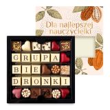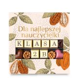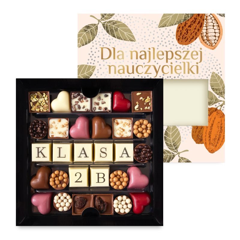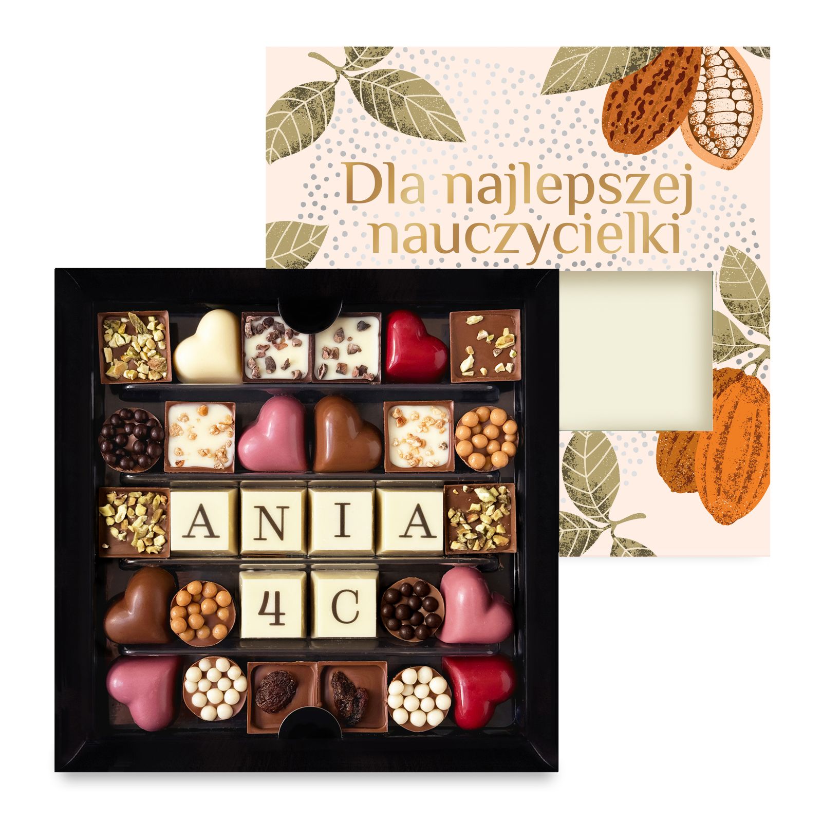 Personalizowany zestaw czekoladek na Dzień Nauczyciela – z możliwością dodania imienia, nazwy klasy lub grupy. Eleganckie pudełko z opaską „Super Nauczycielka” kryje ręcznie tworzone czekoladki z belgijskiej czekolady – starannie dopracowane w każdym detalu i gotowe, by stać się wyjątkową formą podziękowania.