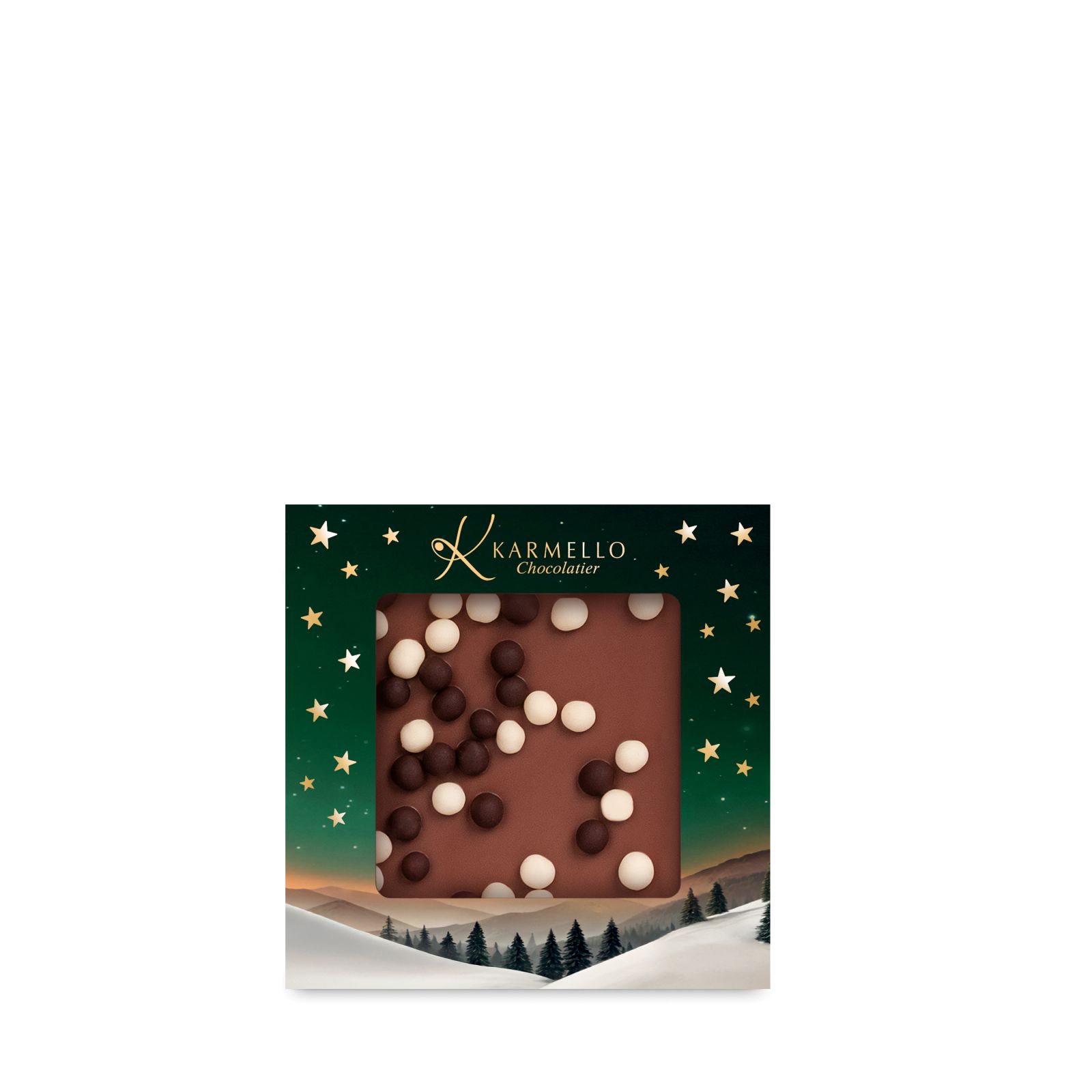 Świąteczna Chrupiąca Czekolada Mleczna to aksamitna belgijska czekolada przełamana przyjemną chrupkością, która rozbudza uśmiech już przy pierwszym kęsie.