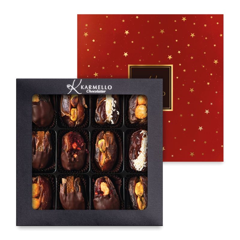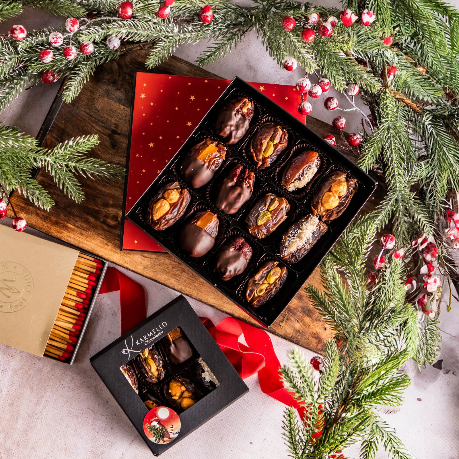 Świąteczna Kolekcja Daktyli to zestaw delikatnych daktyli oblanych czekoladą, z nadzieniami takimi jak migdał z wiśnią, skórka pomarańczy, karmelizowany orzech laskowy, kokos czy pistacja. Naturalna słodycz owocu harmonijnie łączy się z wyrafinowanymi dodatkami, tworząc pełną i dopracowaną kompozycję smakową. Kolekcja wzbogacona o świąteczną opaskę to idealny pomysł na prezent, który pozwala cieszyć się subtelną słodyczą i elegancją.