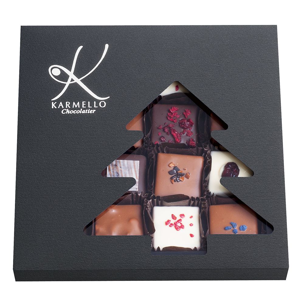 najdelikatniejsze, rozpływające się w ustach praliny w różnorodnych smakach to kompozycja idealna dla każdego, kto zechce delektować się wyjątkowością aromatów karmello. zestaw niezwykle atrakcyjny wizualnie dzięki pudełku z okienkiem w kształcie choinki które sprawia, że praliny wyglądają jak pięknie dobrana, słodka układanka.