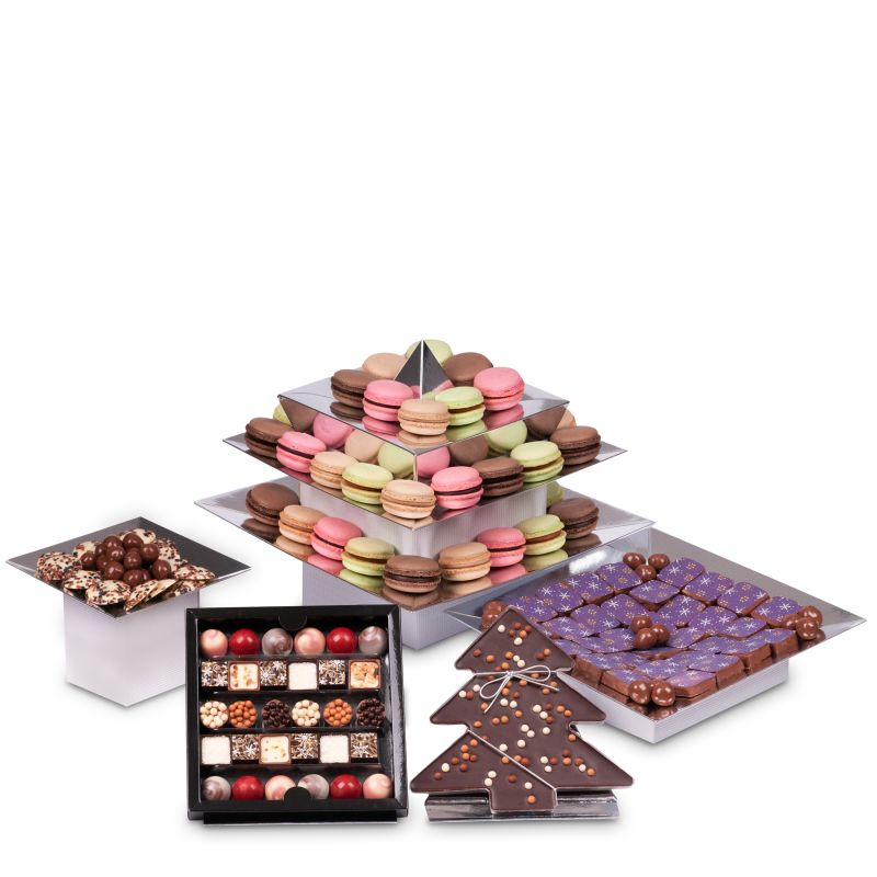 zestaw czekoladek świątecznych czekoladek z kolekcji karmello – to smaki czekoladek wybrane specjalnie na święta. ciasteczka to smak korzennych nut zamknięty w słodyczy białej czekolady. dopełnienie zestawu stanowią praliny orzechowo-karmelowe – delikatne nadzienie na bazie orzechowego nadzienia z kawałkami karmelu, otoczone rozpływającą się w ustach, mleczną czekoladą. w zestawie znajdują się również orzechy laskowe, które idealnie sprawdza się jako mała przekąska. ekspozytor z makaronikami- niezwykle delikatnymi, kruchymi ciasteczkami, wypełnionymi po brzegi rozpływającym się w ustach nadzieniem na bazie czekolady o różnorodnych aromatach lub subtelnego w smaku mascarpone przykuje uwagę każdego gościa.