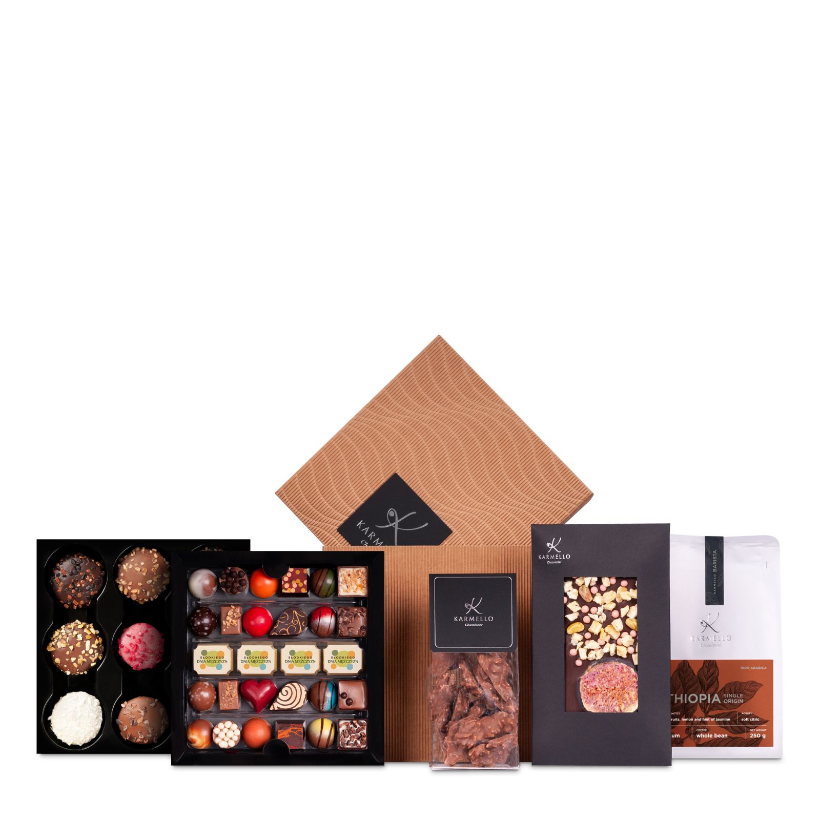 Z okazji Dnia Mężczyzn podaruj niepowtarzalny prezent, który połączy elegancję z wyjątkowym smakiem! Sześcian Karmello to kompozycja, która zadowoli każdego mężczyznę, oferując połączenie słodkich przyjemności i aromatycznych doznań. To perfekcyjny wybór na ten wyjątkowy dzień, który będzie pełen smaku i przyjemności. Dzięki starannie dobranym produktom, ten zestaw sprawi, że Dzień Mężczyzn będzie jeszcze bardziej wyjątkowy.