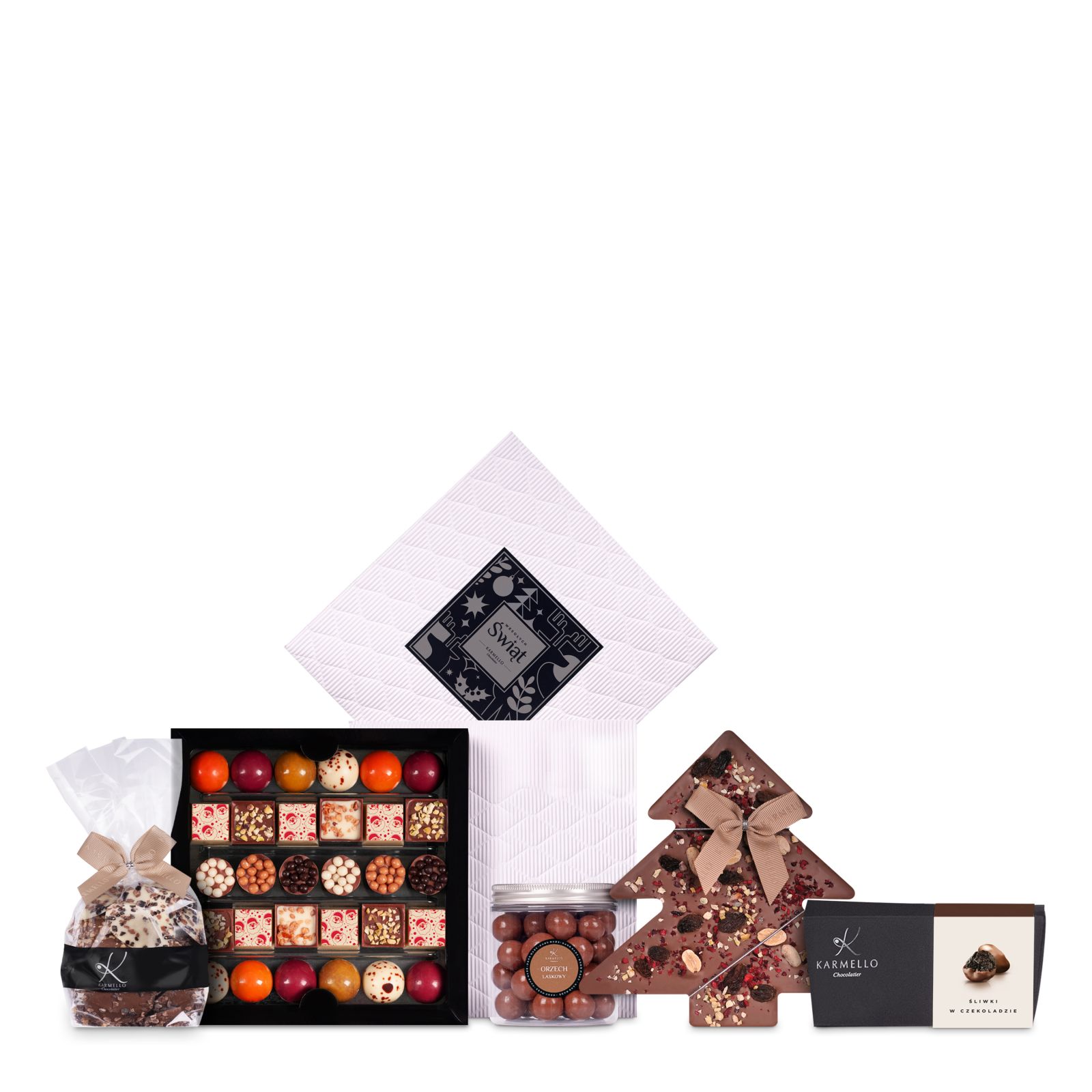 Eleganckie białe opakowanie zawiera produkty, które przypadną do gustu każdej obdarowanej osobie. Każdy znajdzie coś dla siebie od czekoladek z nadzieniem, owoców oblanych czekoladą po bakalie oblane w belgijskiej czekoladzie. Idealna propozycja na Bożonarodzeniowy podarunek.