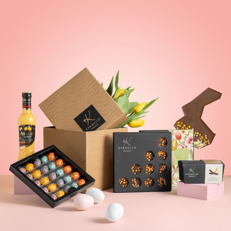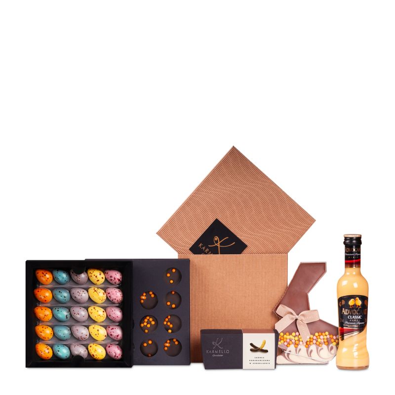 Wielkanocny zestaw pełen kontrastów: czekoladowe klasyki przełamane cytrusową świeżością. W eleganckim opakowaniu znajdziesz kolekcję wielkanocnych pisanek, pomarańczowe Fruzzle, skórkę pomarańczy w czekoladzie, mlecznego zająca oraz klasyczny Advocaat 200ml – harmonijne smaki i dopracowana forma w jednej kompozycji.