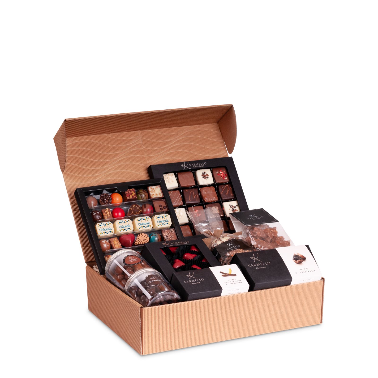 Połączenie doskonałego smaku i wyglądu naszych produktów w praktycznym wydaniu. Kompozycja szkatuła zachwyci wzrok i podniebienie każdego Chłopaka w dniu Jego święta.